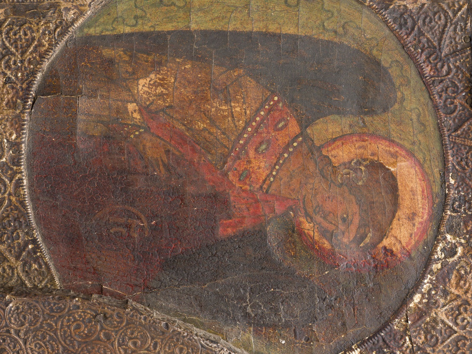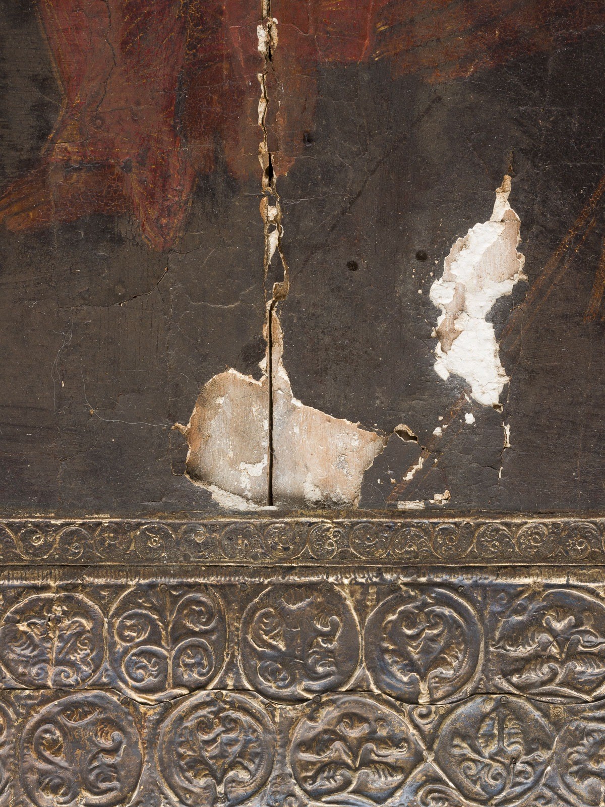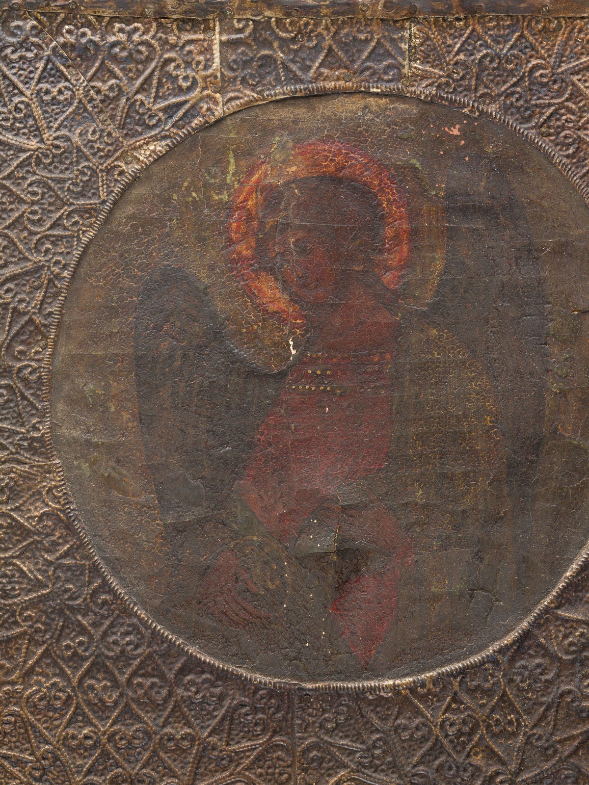 Verbund zweier Bretter mit zwei Rückseiten-Sponki. Eitempera auf Kreidegrund. Metallriza mit reliefiertem Blattrankendekor. 84 x 57,8 cm. In den oberen Ecken erscheinen die Erzengel Michael und Gabriel. Vertikale Rissbildung, partiell rest., Substanzverluste.