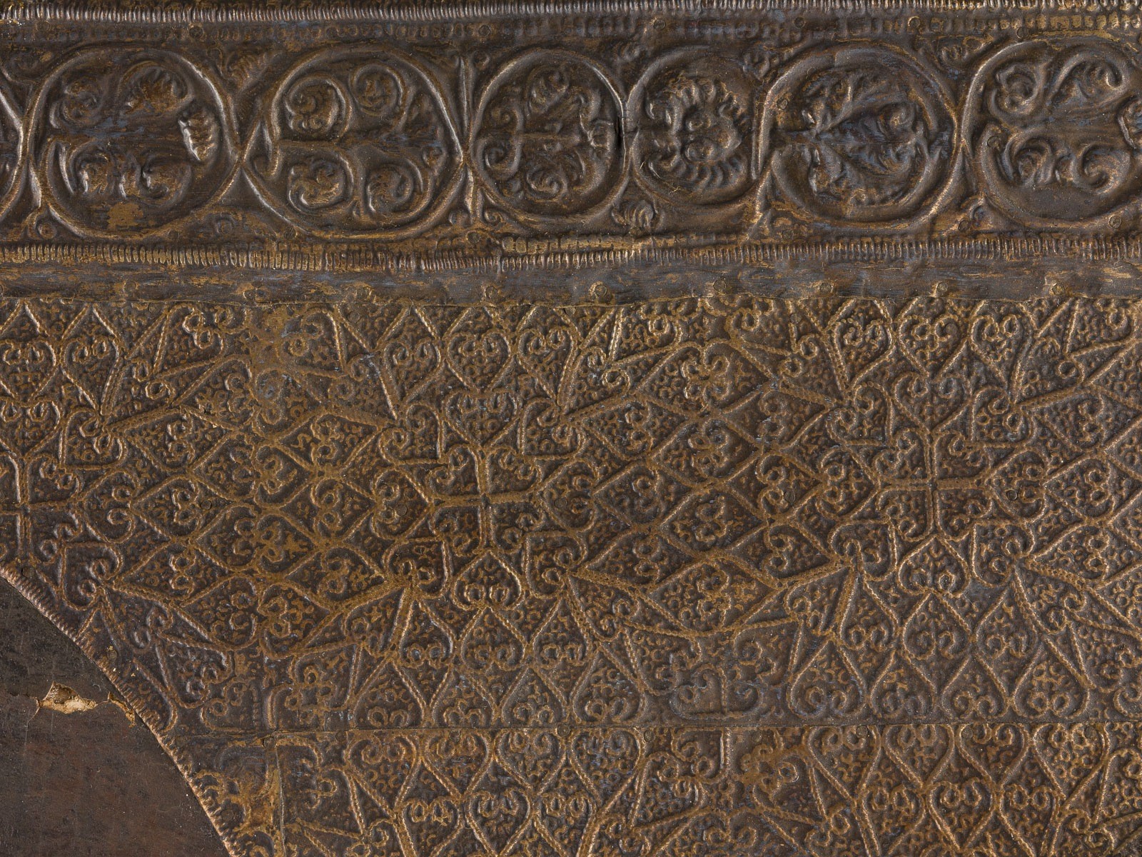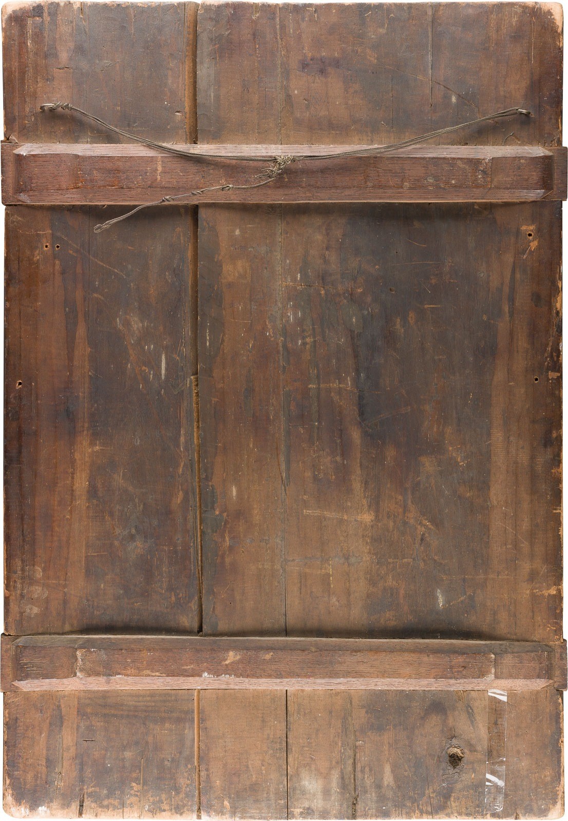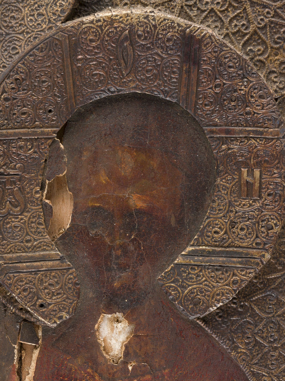 Verbund zweier Bretter mit zwei Rückseiten-Sponki. Eitempera auf Kreidegrund. Metallriza mit reliefiertem Blattrankendekor. 84 x 57,8 cm. In den oberen Ecken erscheinen die Erzengel Michael und Gabriel. Vertikale Rissbildung, partiell rest., Substanzverluste.