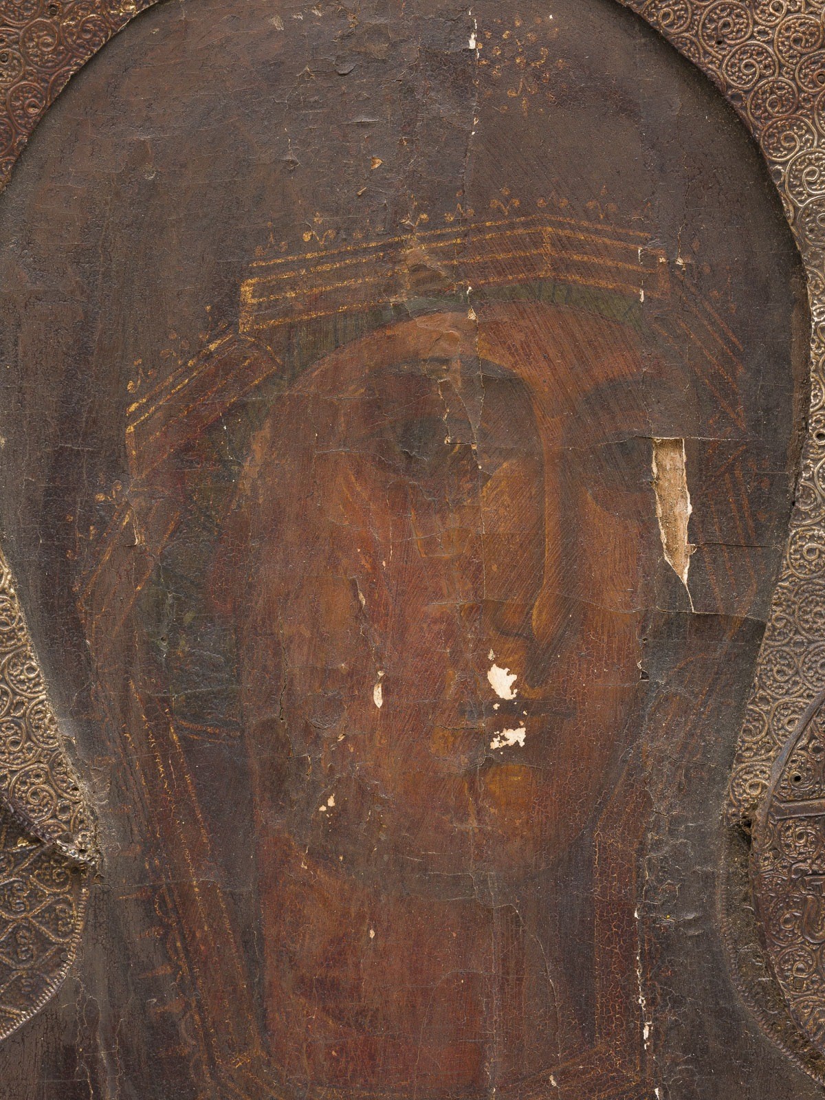 MONUMENTALE UND SEHR FEINE IKONE MIT DER GOTTESMUTTER VON SMOLENSK (SMOLENSKAJA) MIT RIZA AUS EINER KIRCHEN-IKONOSTASE
