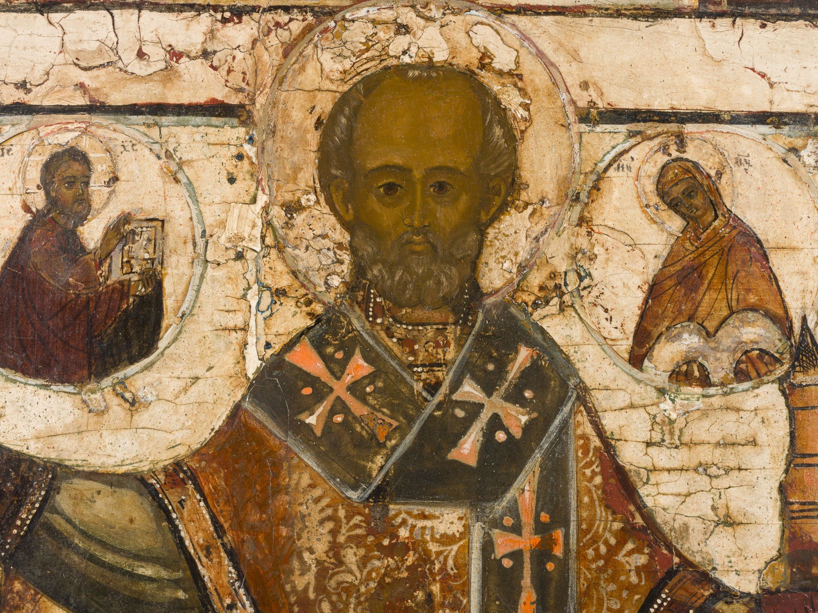 Aus vier Laubholz-Brettern zusammengefügtes Bildfeld mit zwei Rückseiten-Sponki (verloren). Kowtscheg, Lewkas, Eitempera. 105,5 x 87 cm. Im Bildzentrum streng frontale Wiedergabe des Heiligen mit ausgestreckten Armen. In seiner