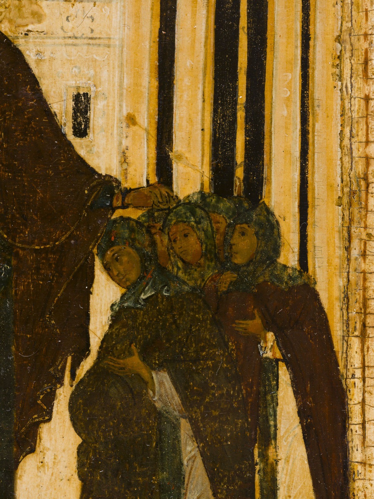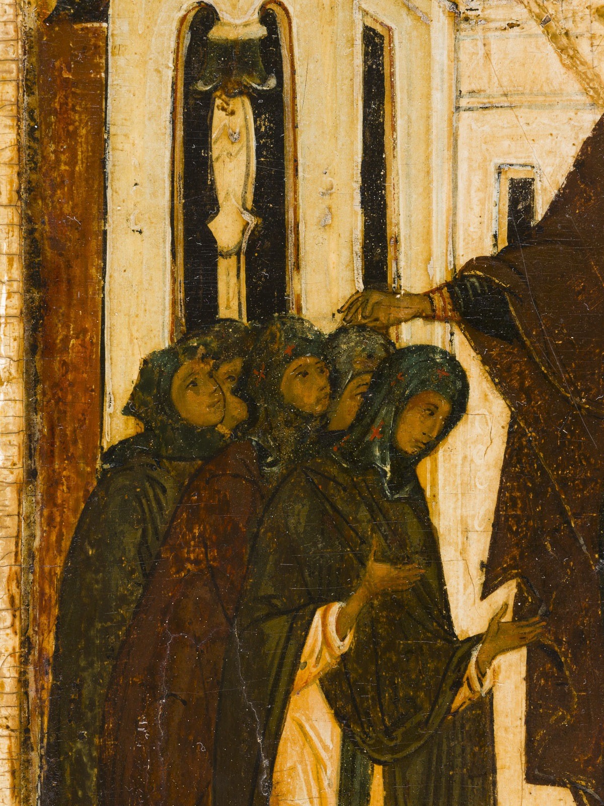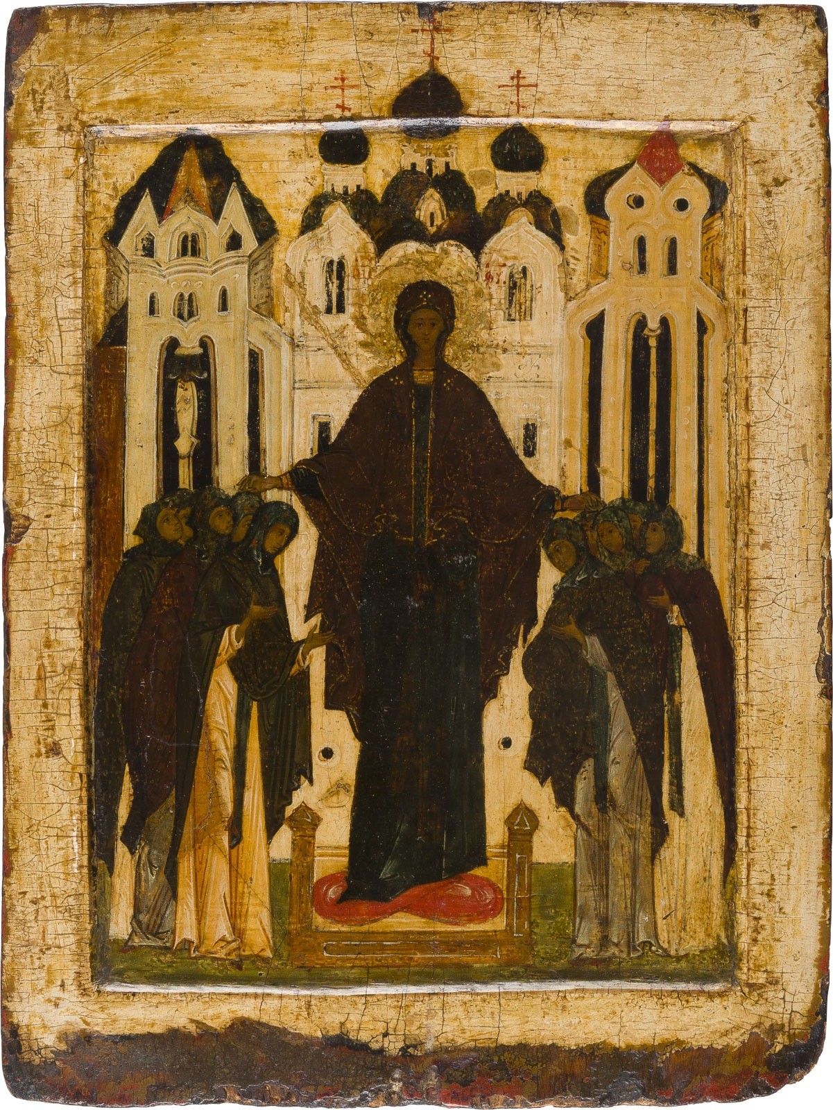 Im Zentrum thront die Gottesmutter mit ausgebreiteten Armen. Umgeben ist sie von Nonnen,