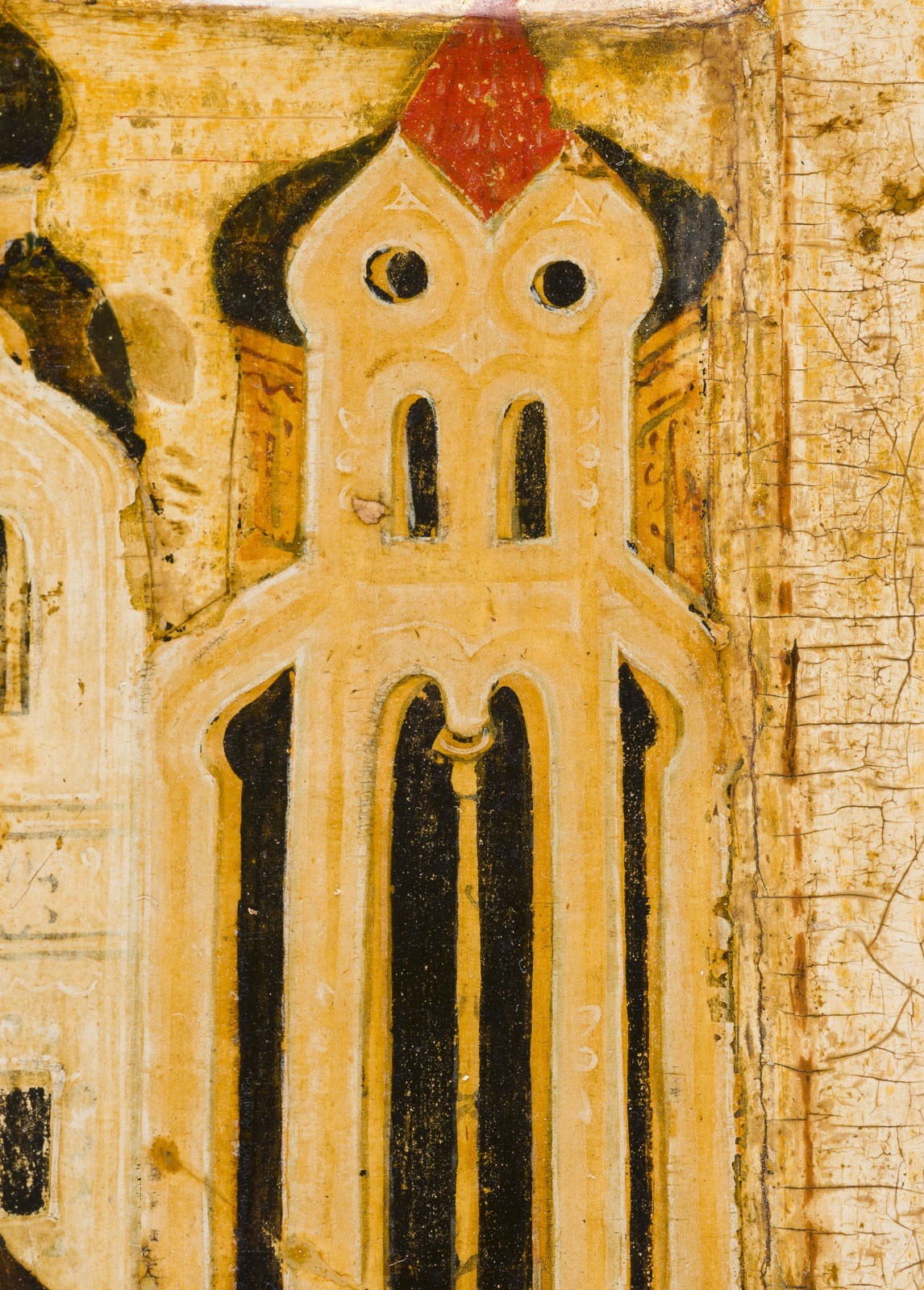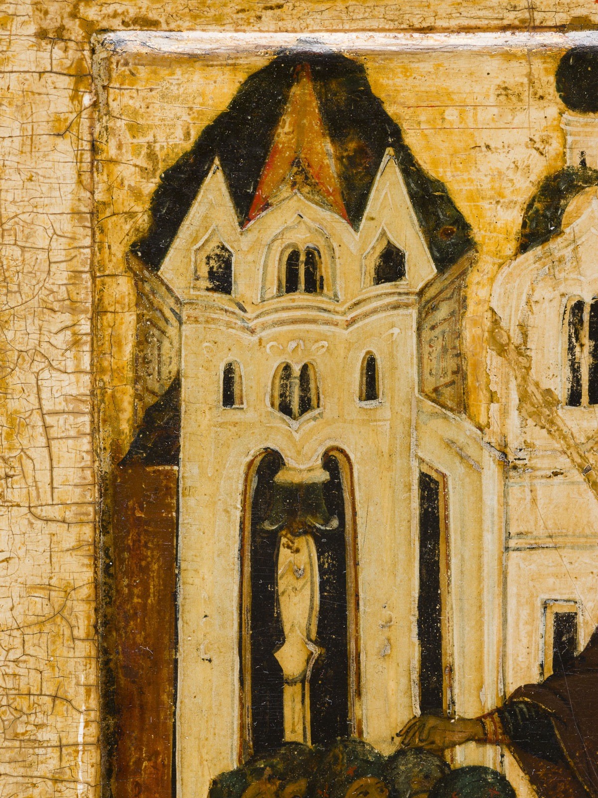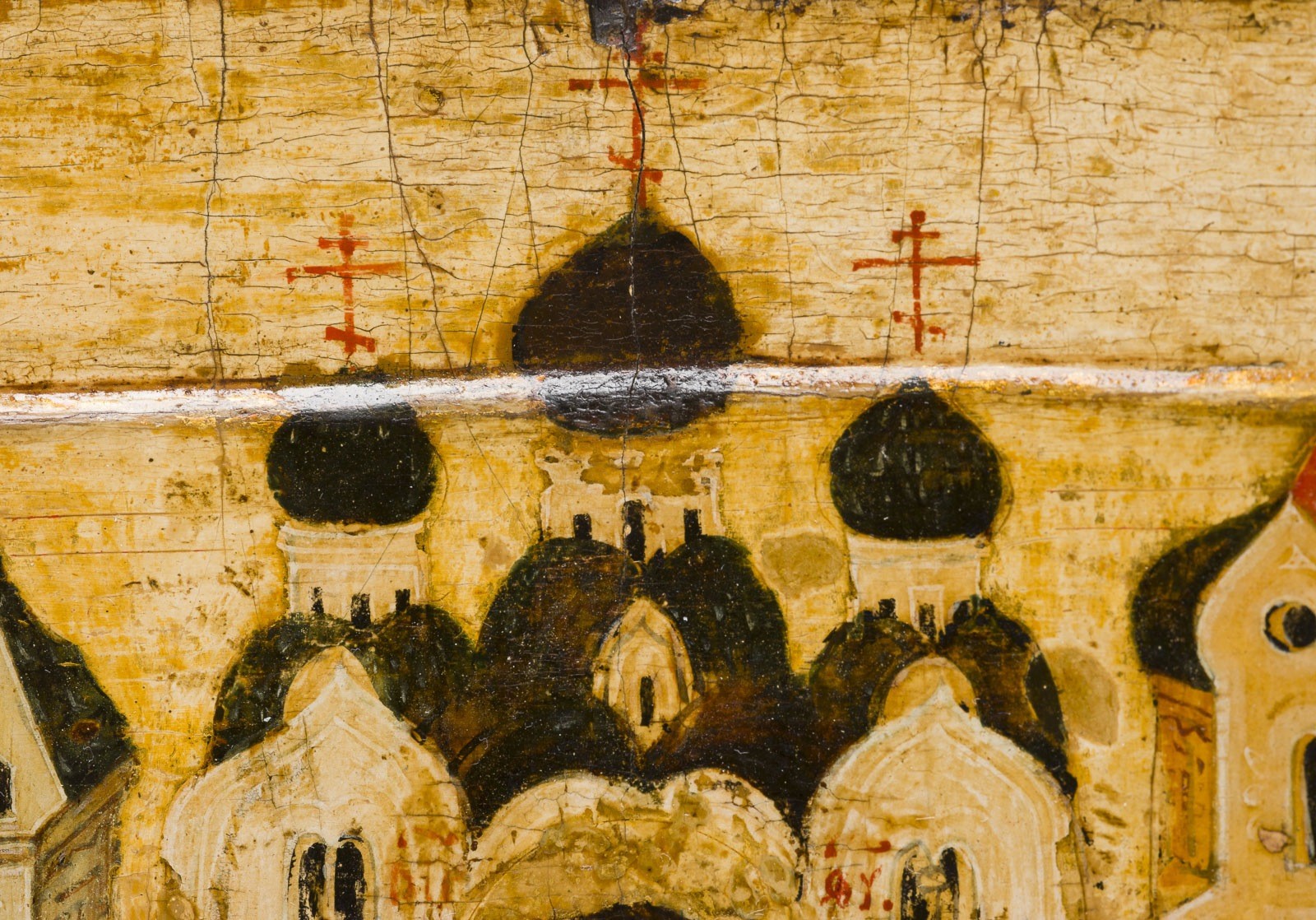 Einzeltafel mit einer Rückseiten-Querleiste. Kowtscheg, Eitempera auf Kreidegrund, Goldgrund. 27,8 x 21 cm. Die seltene Komposition illustriert den 10. Ikos des berühmten Akathistos-Hymnus an die