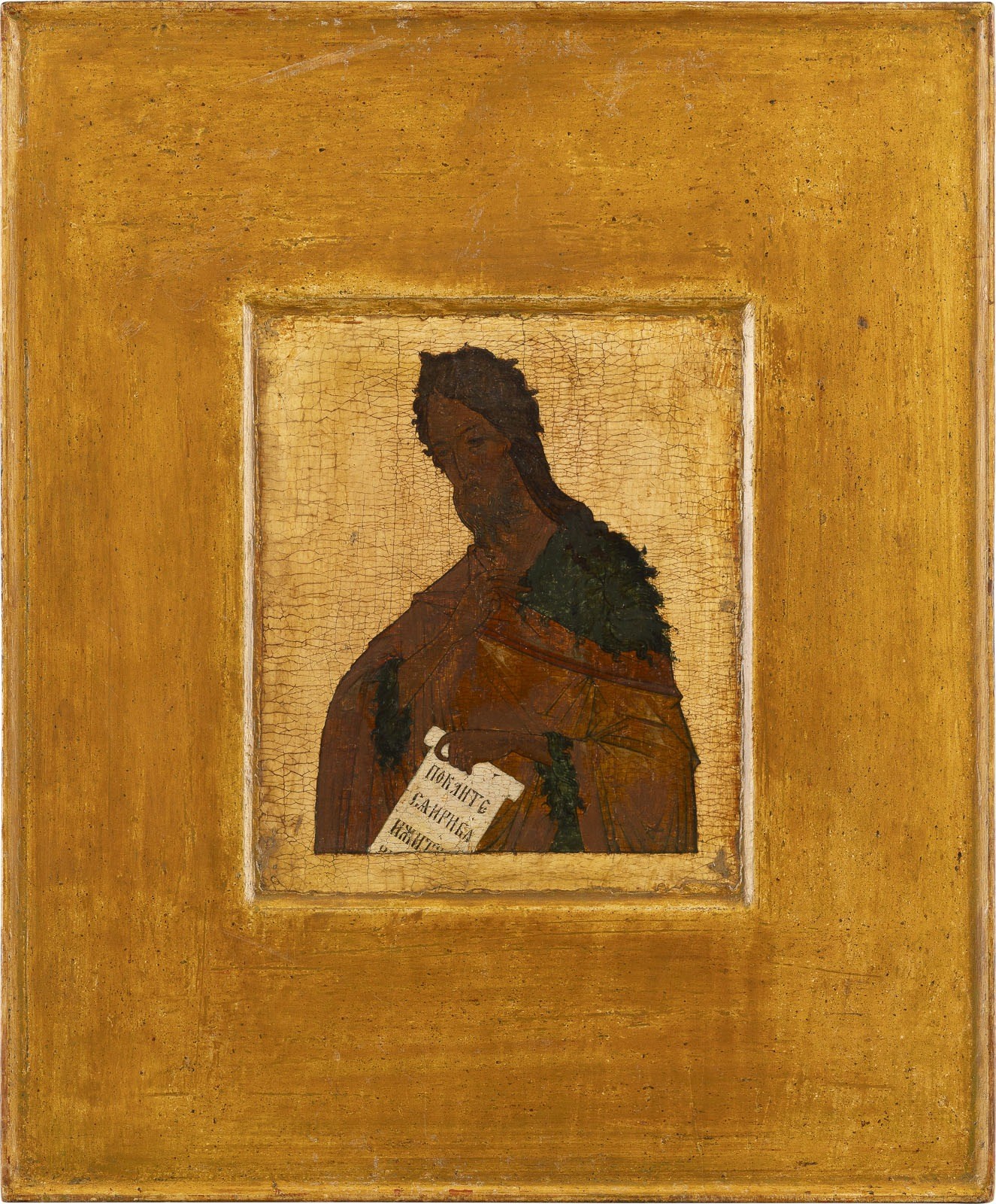 Holztafel mit zwei Rückseiten-Sponki. Doppeltes Kowtscheg, Eitempera auf Kreidegrund. 31,2 x 26 cm. Bestehend aus einer Ikone mit der Gottesmutter und einer Ikone mit Johannes dem Vorläufer.