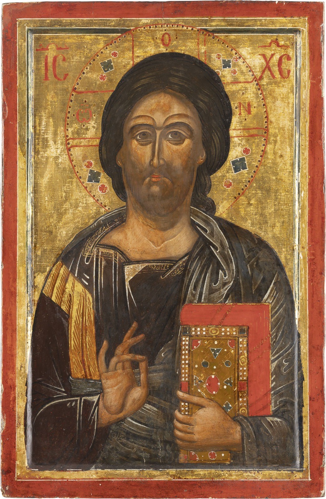 PAAR MONUMENTALE IKONEN AUS EINER KIRCHEN-IKONOSTASE: GOTTESMUTTER HODEGETRIA UND CHRISTUS PANTOKRATOR