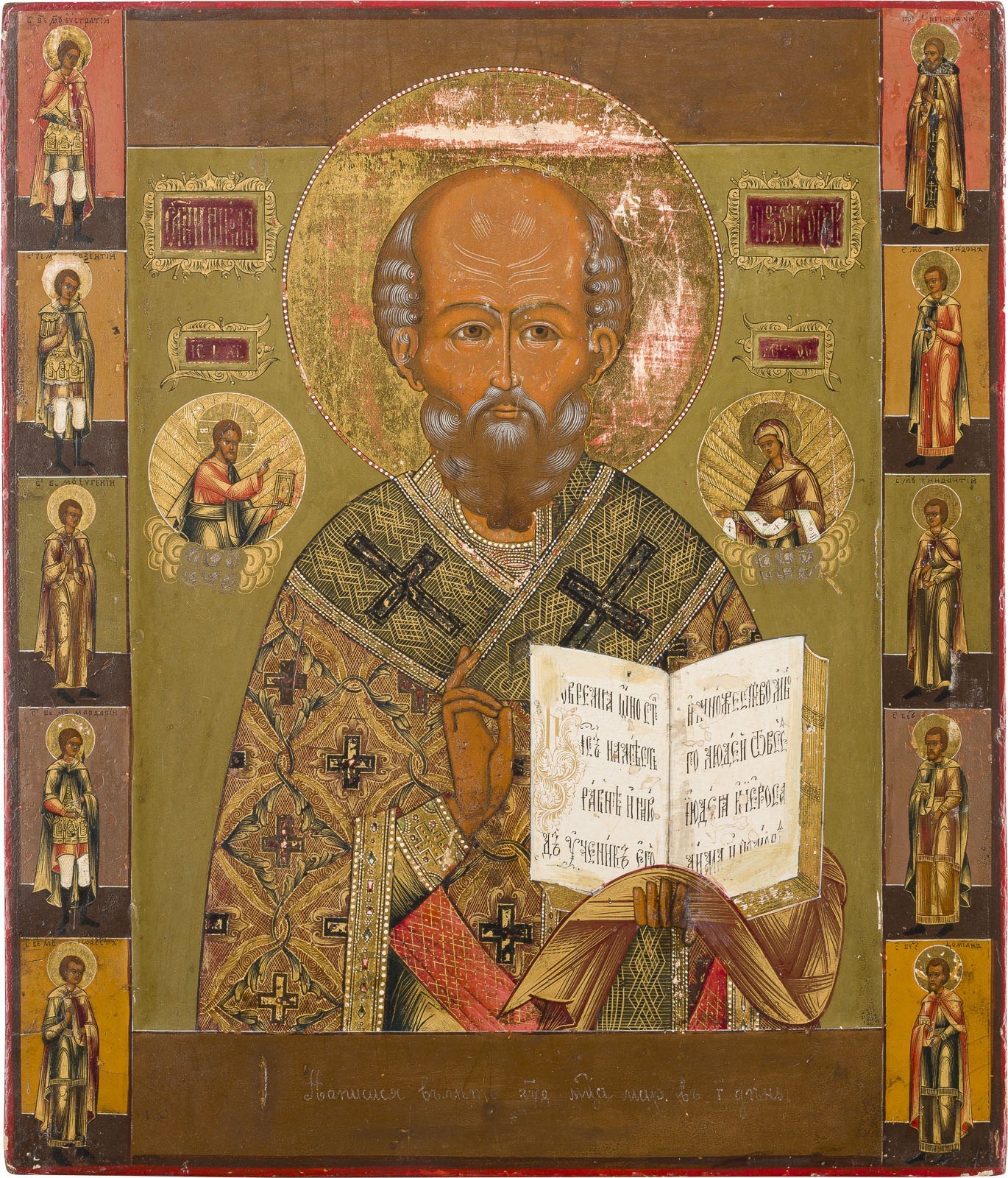 Laubholz-Tafel mit zwei Stirnseiten-Sponki. Kowtscheg, Lewkas, Eitempera, Nimben vergoldet. 30,9 x 26,4 cm. Am unteren Rand kyrillische Datierung 'Gemalt im Jahr 1901 im Monat März am 3. Tag'. Zehn Randheilige, darunter Kriegerheilige und Heiler. Min. rest.