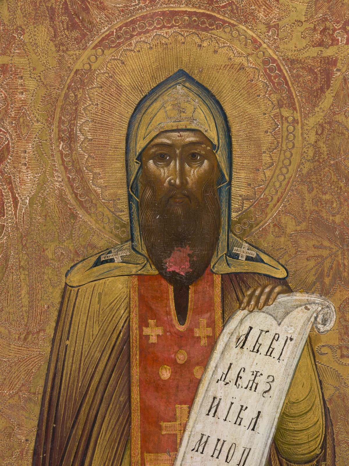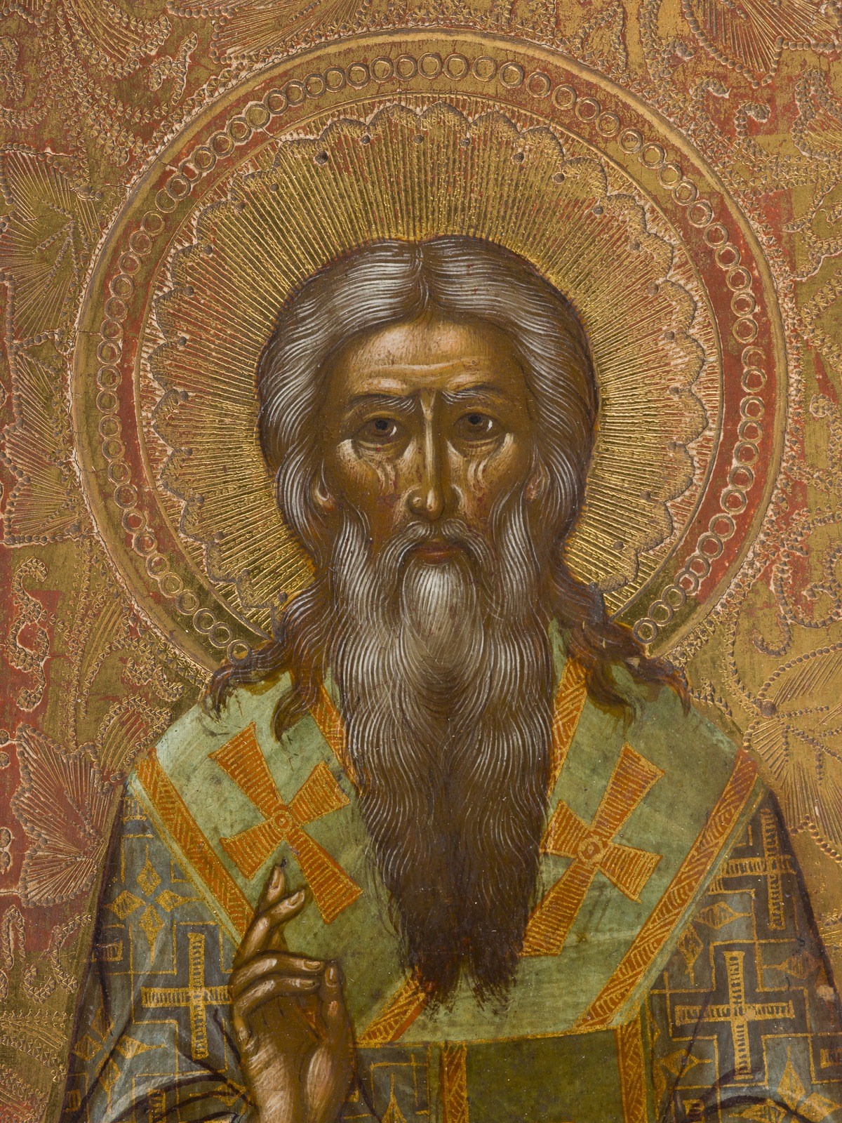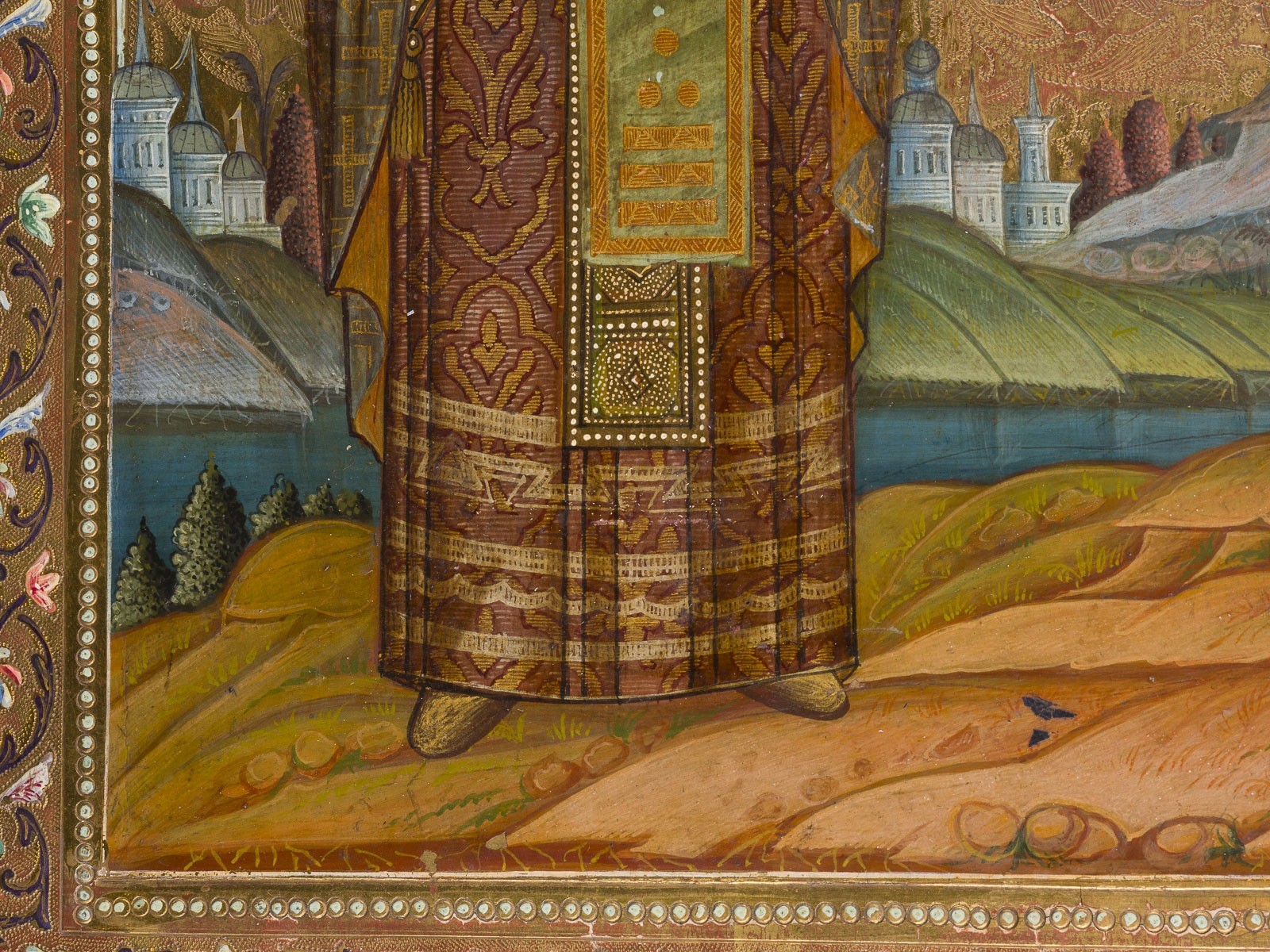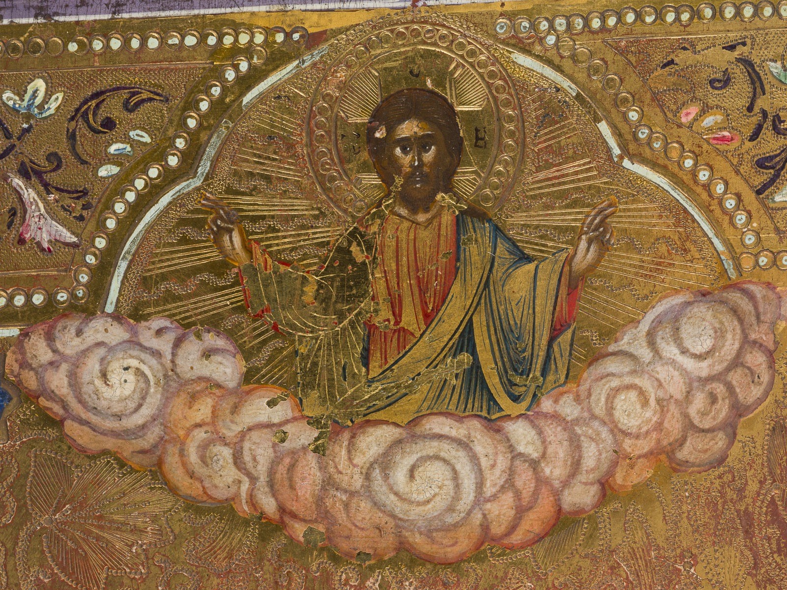 Chrysographie und reicher geometrischer Ornamentierung. Feine Modellierung der Inkarnate. Min. Farbabsplitterungen.