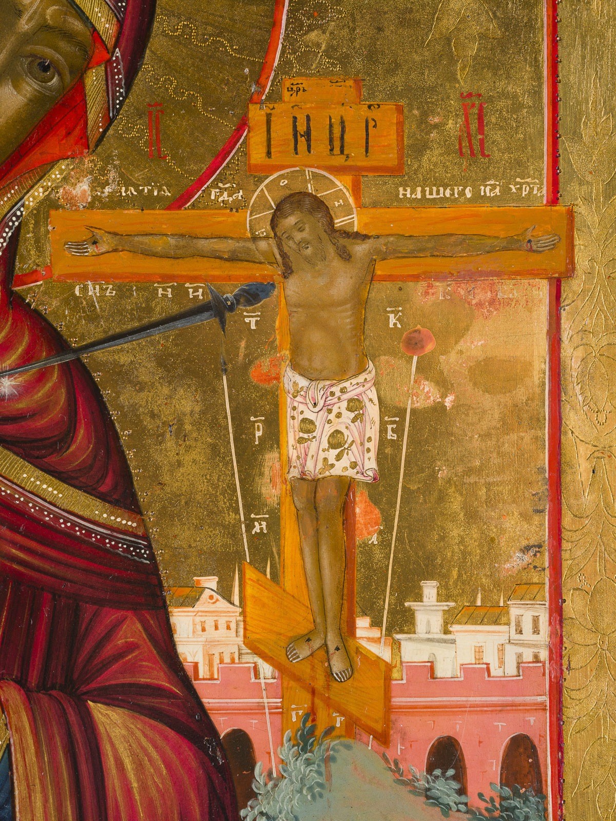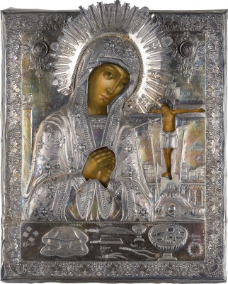 SEHR FEINE IKONE MIT DER GOTTESMUTTER 'DIE PROPHEZEIUNG DES SIMEON' MIT SILBER-OKLAD