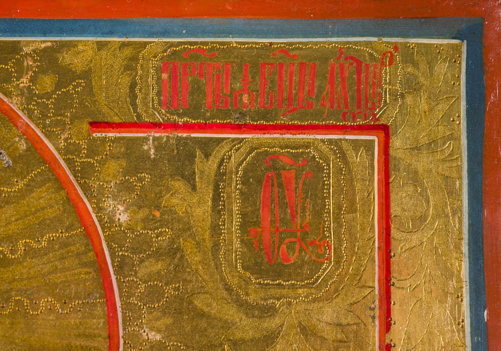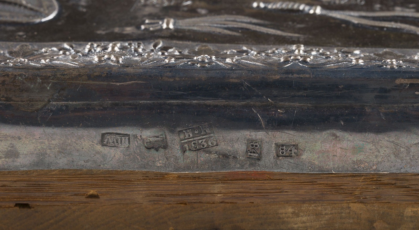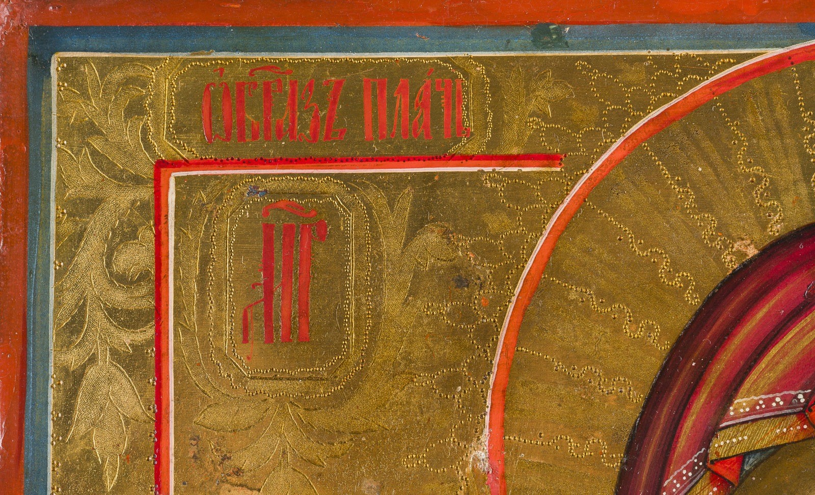 Einzeltafel mit zwei Stirnseiten-Sponki. Eitempera auf Kreidegrund, Goldgrund und Rand mit vegetabilen Motiven fein punziert. Oklad aus Silber mit kräftig getriebenem Dekor. 35,5 x 29,2 cm. Punziert mit Stadtmarke, Beschaumeisterzeichen, Feingehalt '84' und Meisterzeichen. Punktuelle Einstimmungen.