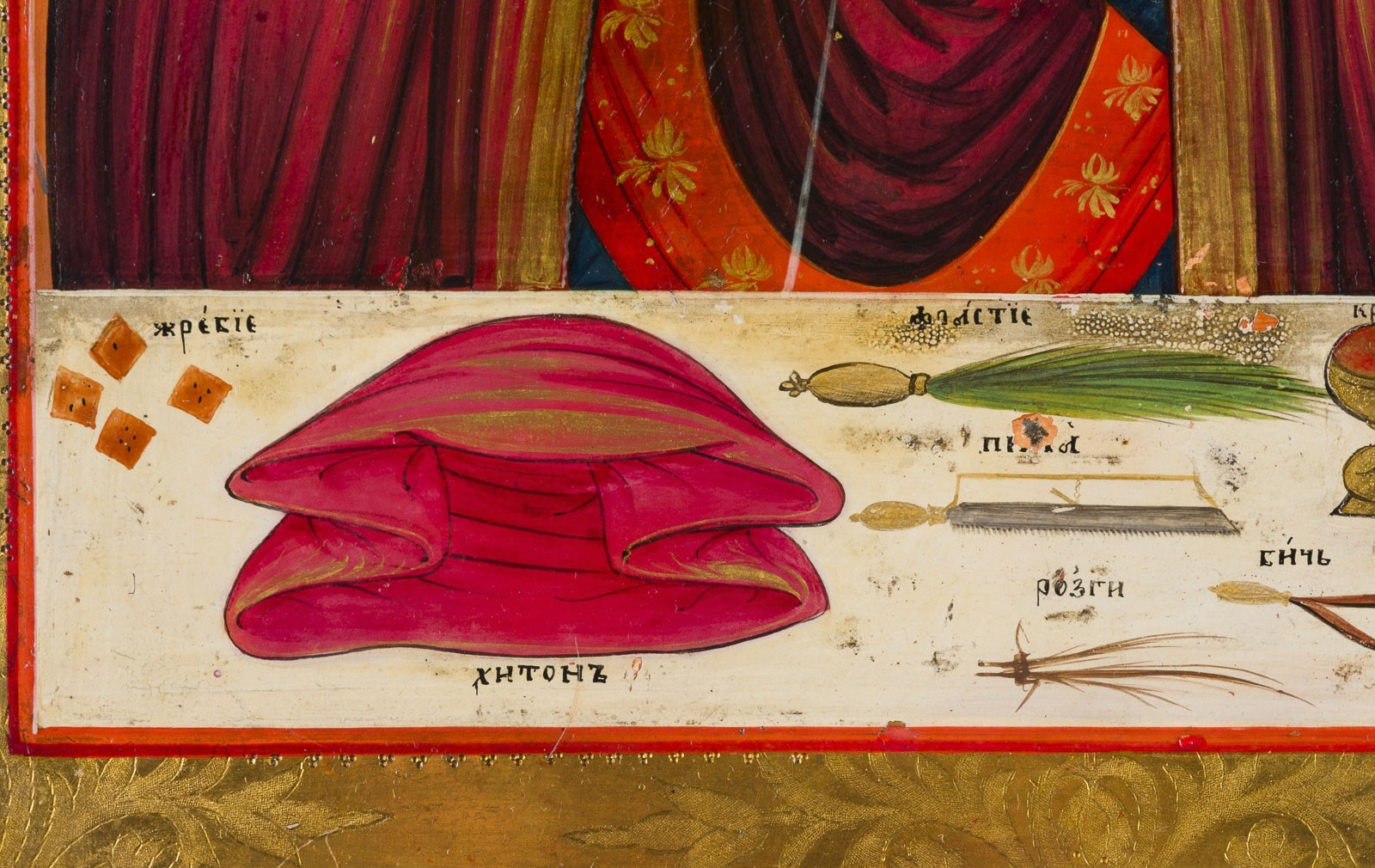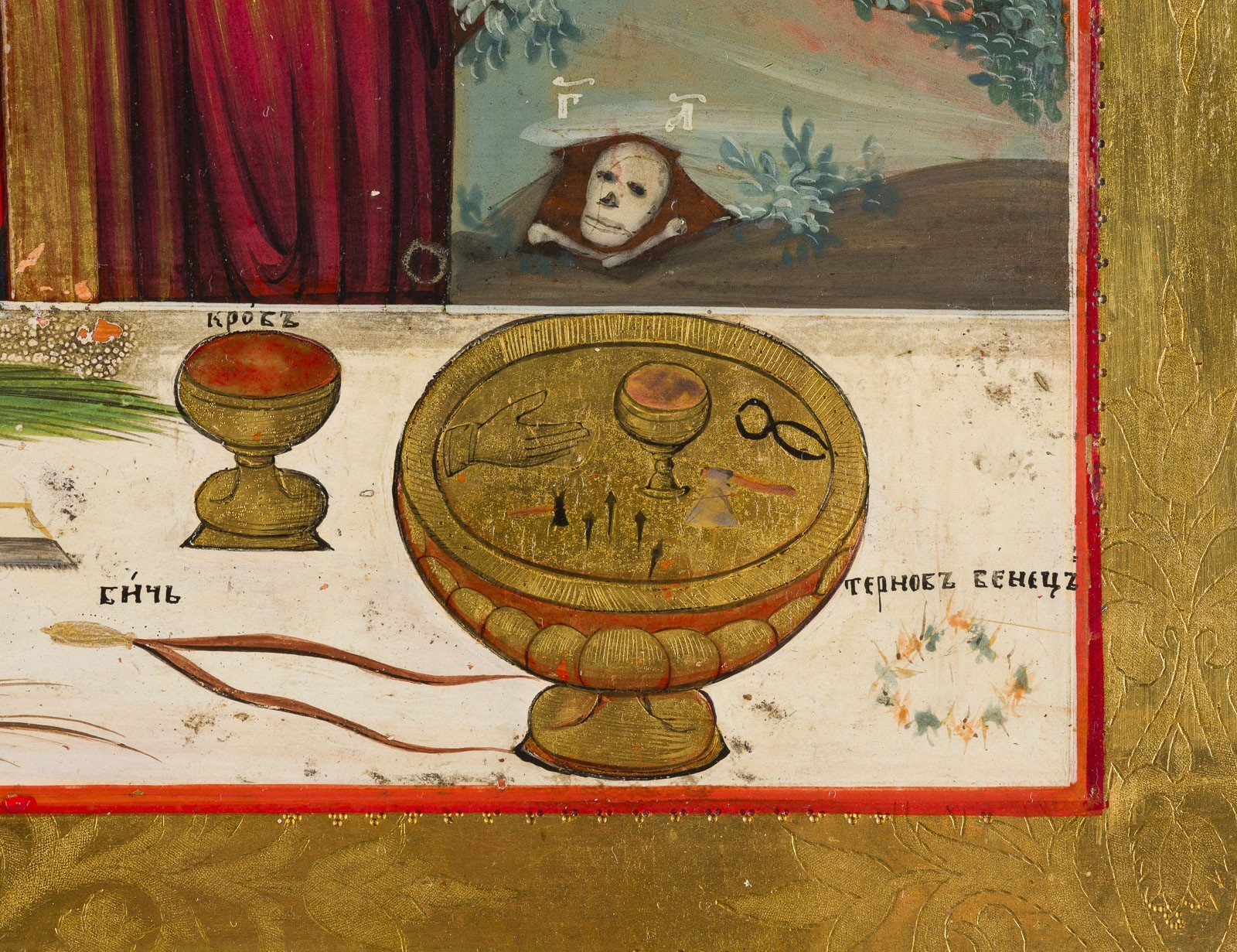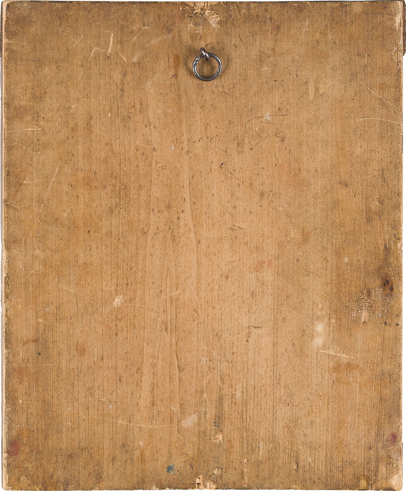 Einzeltafel mit zwei Stirnseiten-Sponki. Eitempera auf Kreidegrund, Goldgrund und Rand mit vegetabilen Motiven fein punziert. Oklad aus Silber mit kräftig getriebenem Dekor. 35,5 x 29,2 cm. Punziert mit Stadtmarke, Beschaumeisterzeichen, Feingehalt '84' und Meisterzeichen. Punktuelle Einstimmungen.