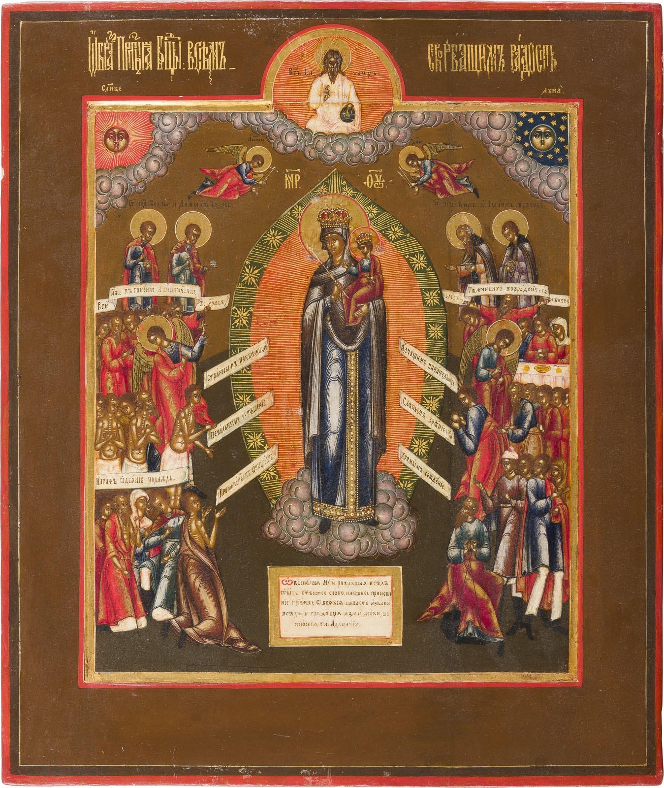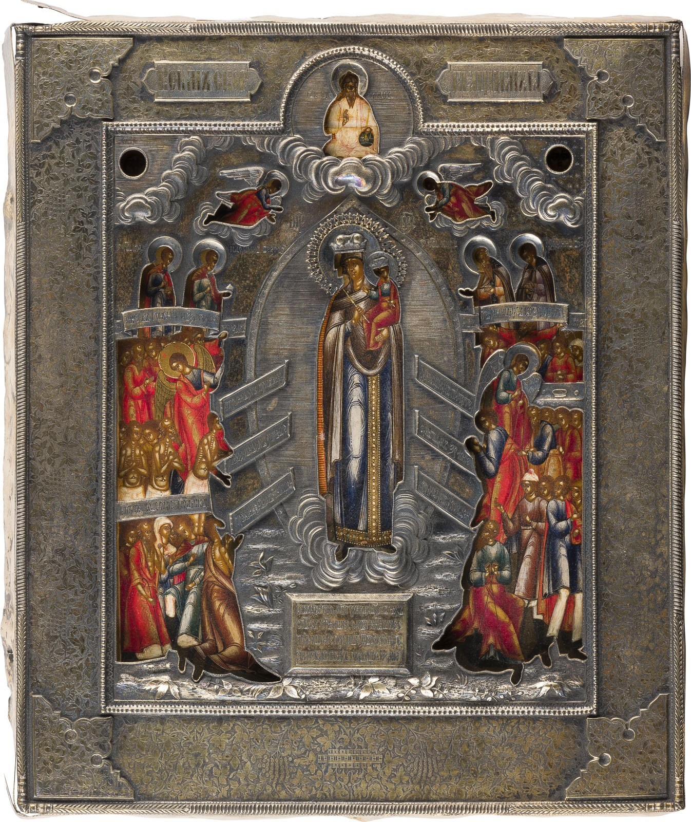 SEHR FEINE IKONE MIT DER GOTTESMUTTER 'FREUDE ALLER LEIDENDEN' MIT VERMEIL-RIZA