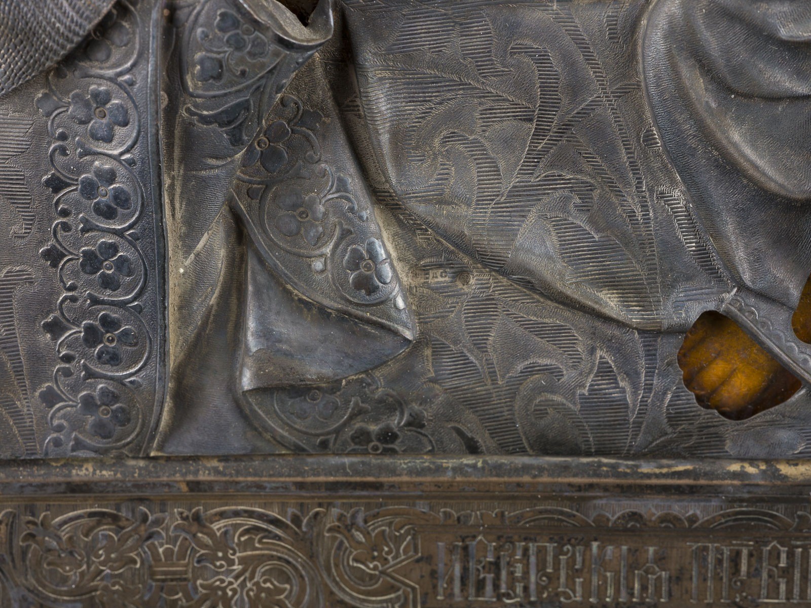 Verbund dreier Bretter. Ölmalerei. Oklad aus vergoldetem Silber mit gravierter Blattranke entlang der Ränder. Emaillierte Nimben. 30,8 x 26,4 cm. Punziert mit Marke der Bezirksbeschauadministration mit Feingehalt '84' und Meisterzeichen 'AS' in Kyrillisch.