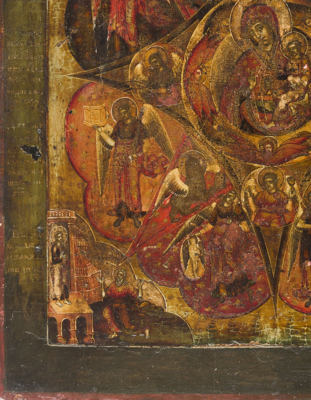 Einzeltafel mit zwei Stirnseiten-Sponki. Eitempera auf Kreidegrund, partielle Vergoldung. 30,8 x 26,2 cm. In äußerst feiner Miniaturmalerei ausgeführte Ikone mit detailreicher Ausarbeitung der
