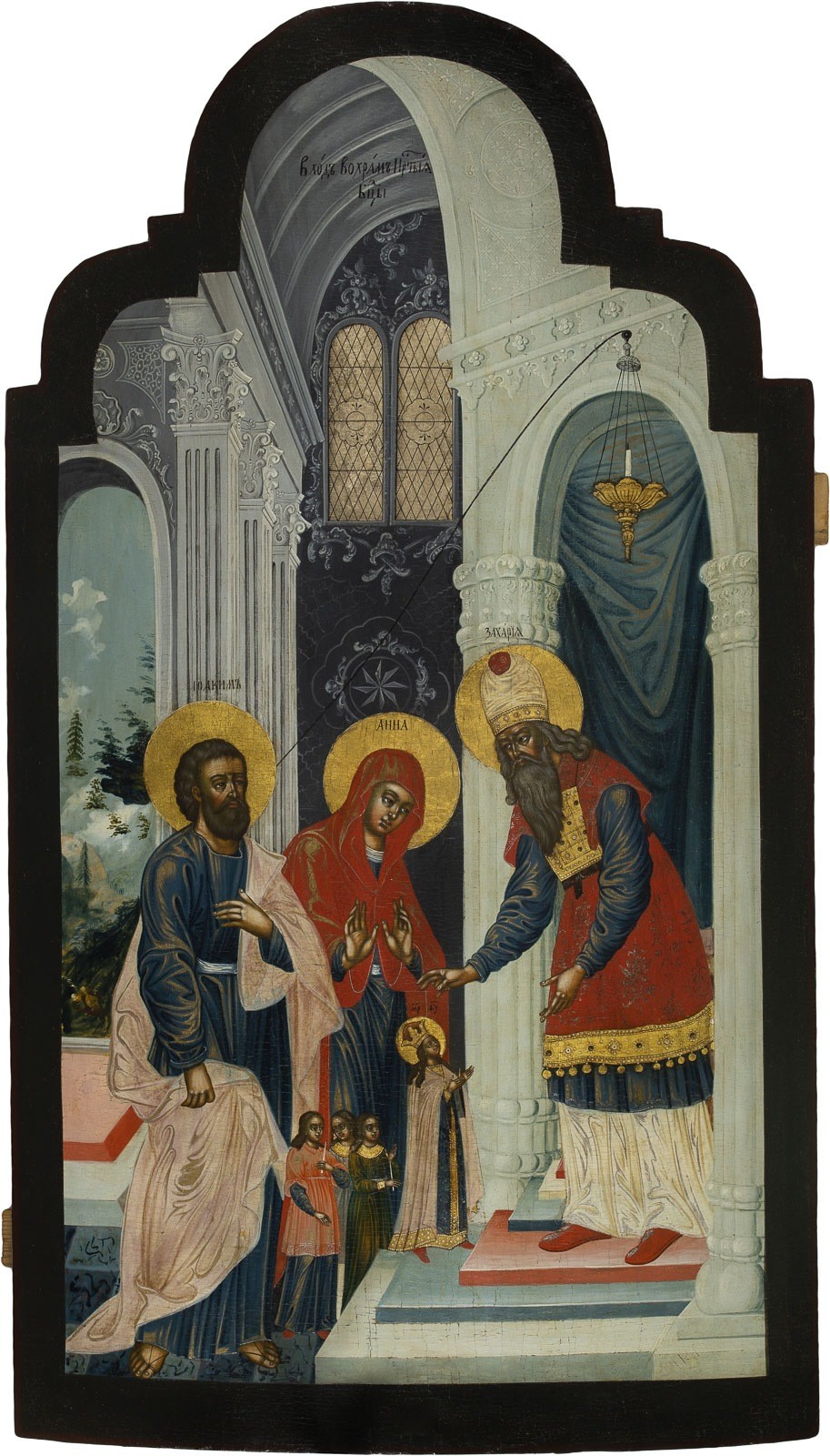 SEHR FEINE UND MONUMENTALE IKONE MIT DEM TEMPELGANG DER GOTTESMUTTER AUS EINER KIRCHEN-IKONOSTASE