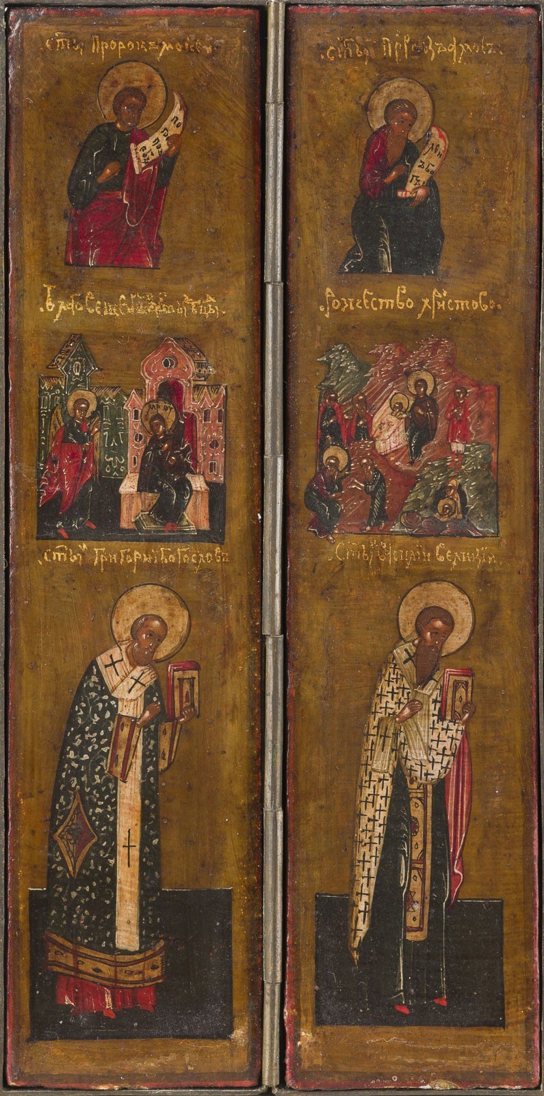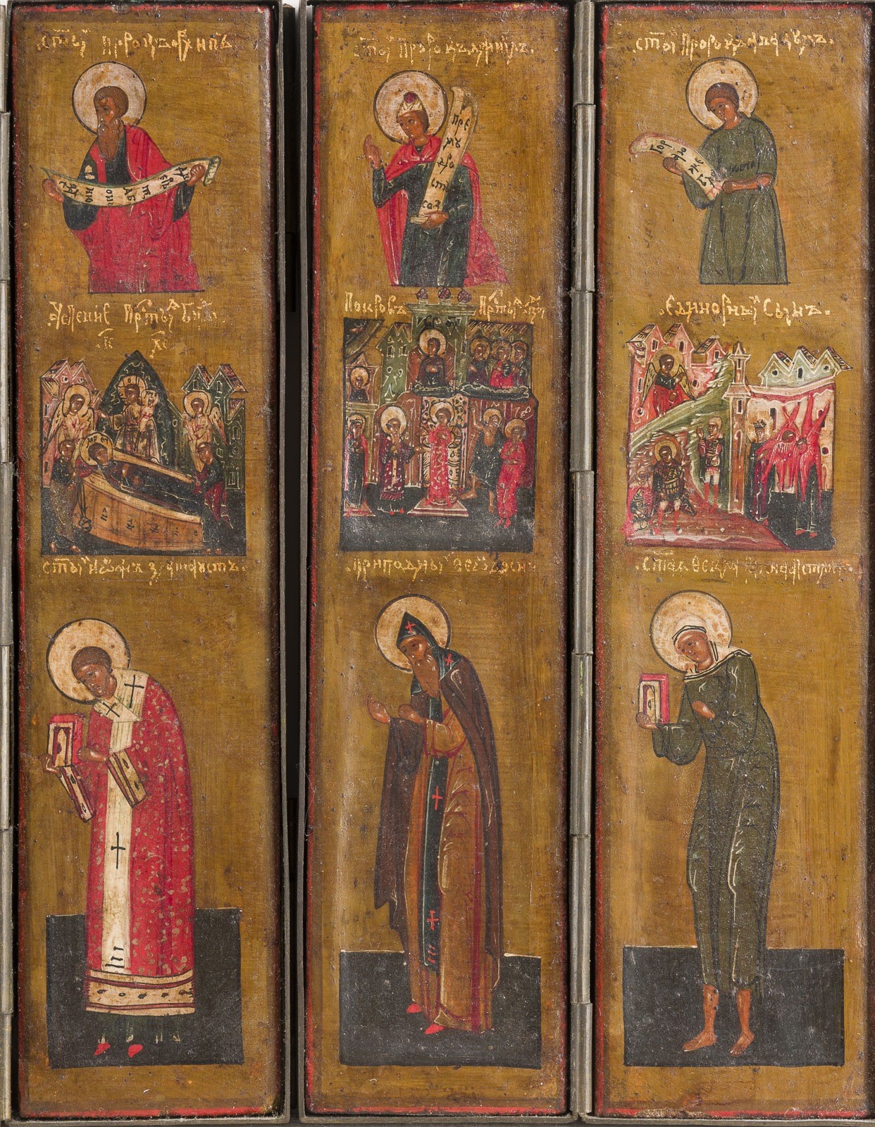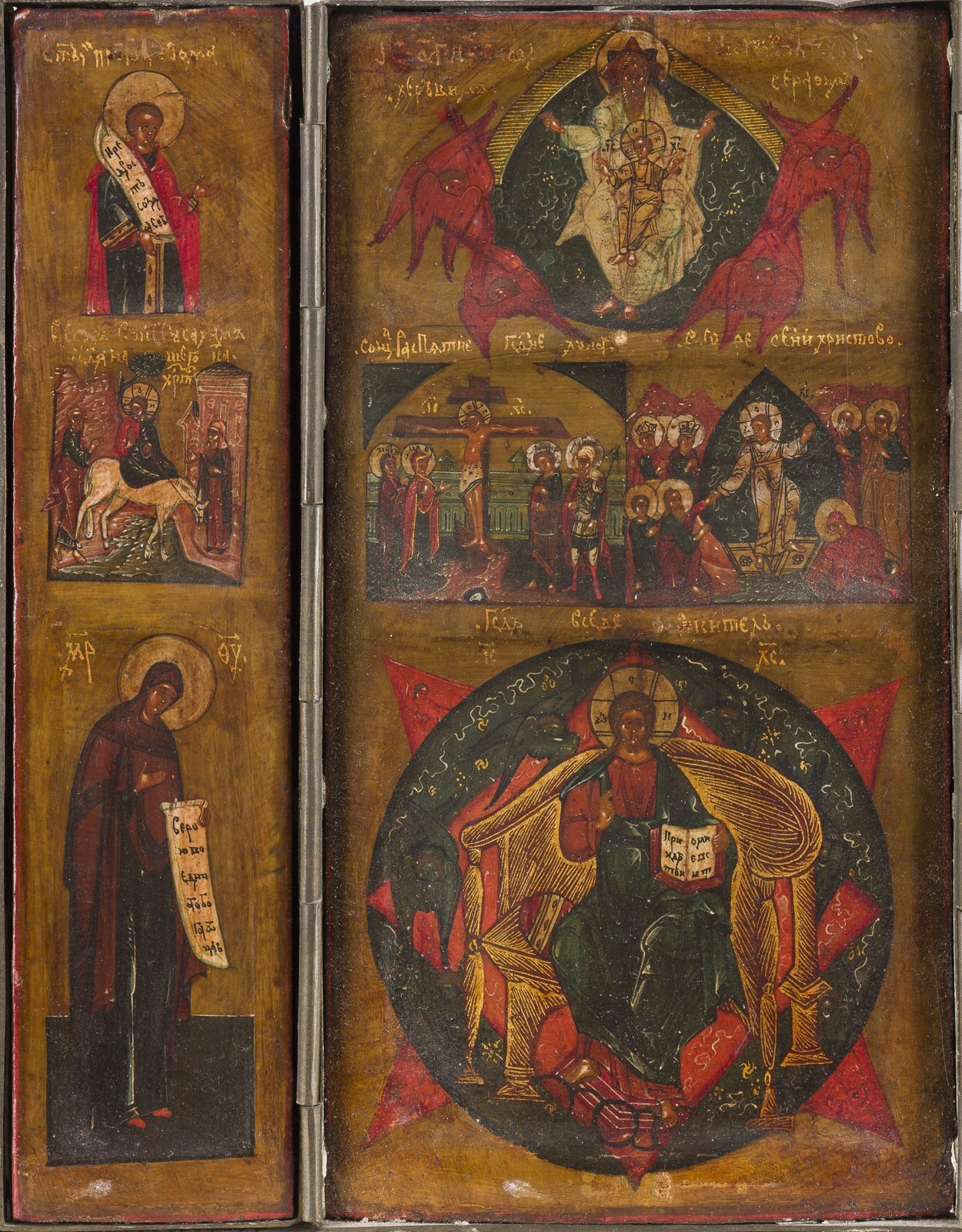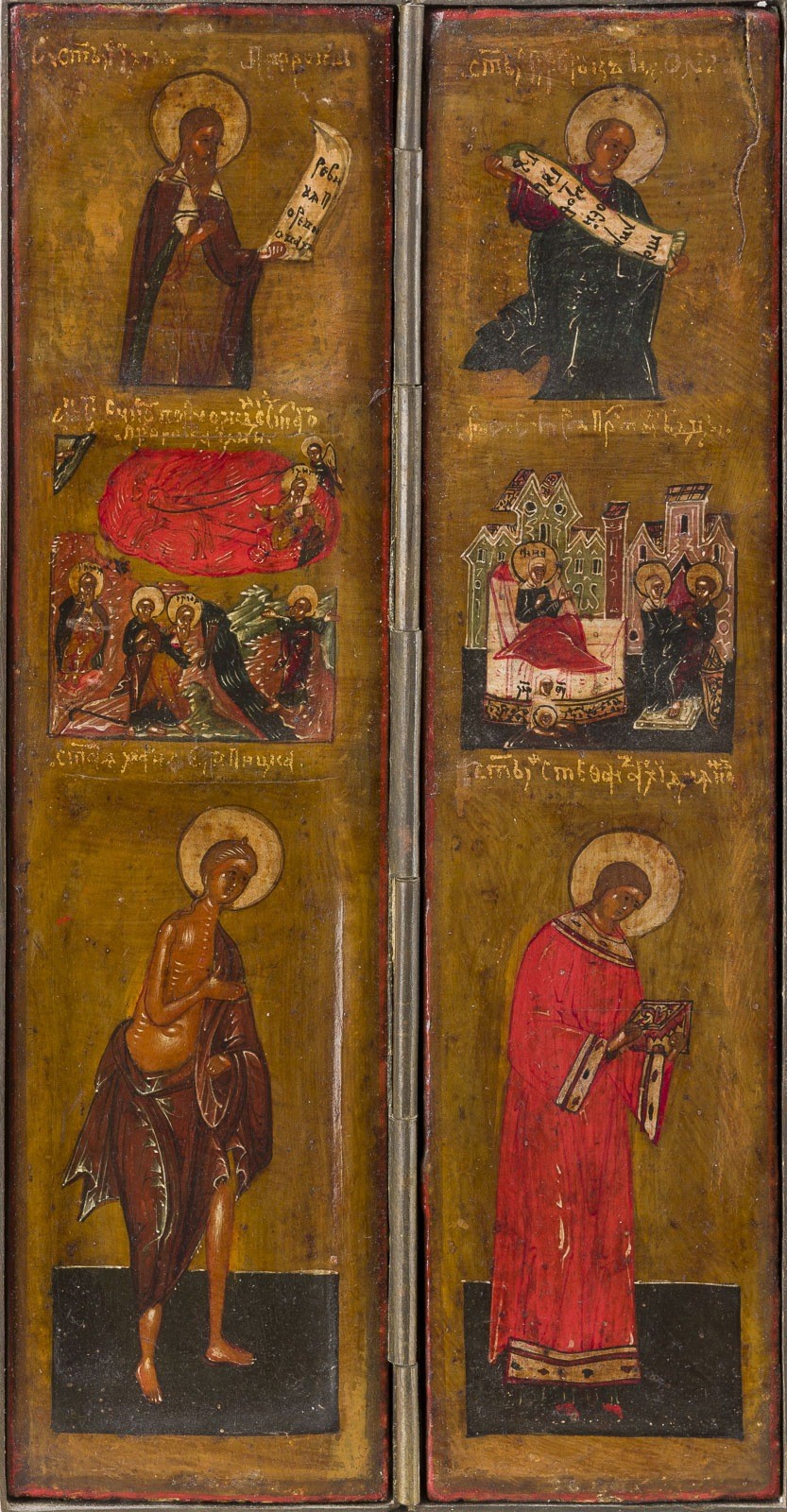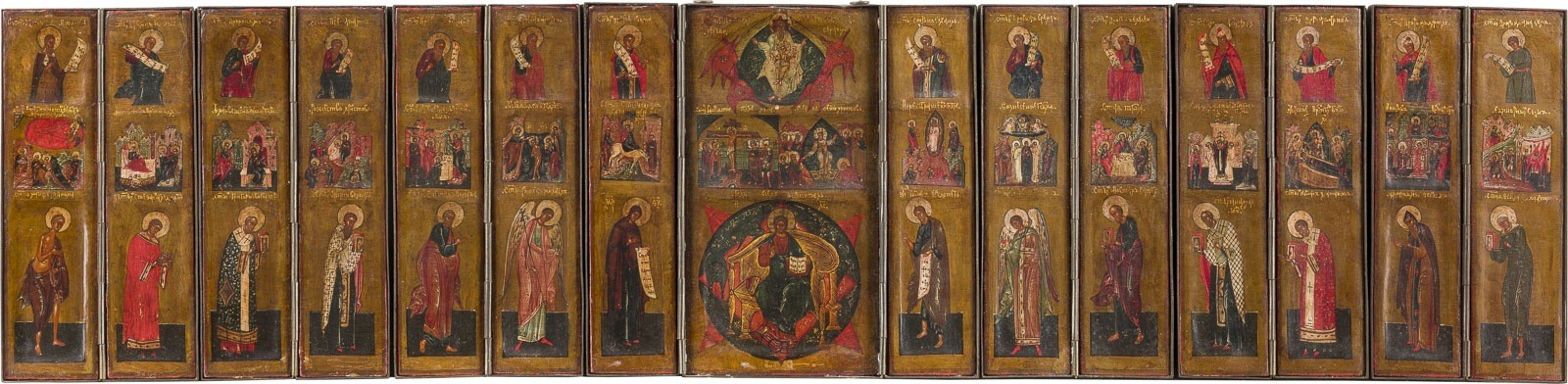 15 Holztafeln mit Kowtscheg, Eitempera auf Kreidegrund, partielle Vergoldung, versilberte Nimben. Metallmontierung. 17,7 x 74 cm (geöffnet). In Miniaturmalerei ausgeführte Malerei über drei Register mit dem thronenden Christus im