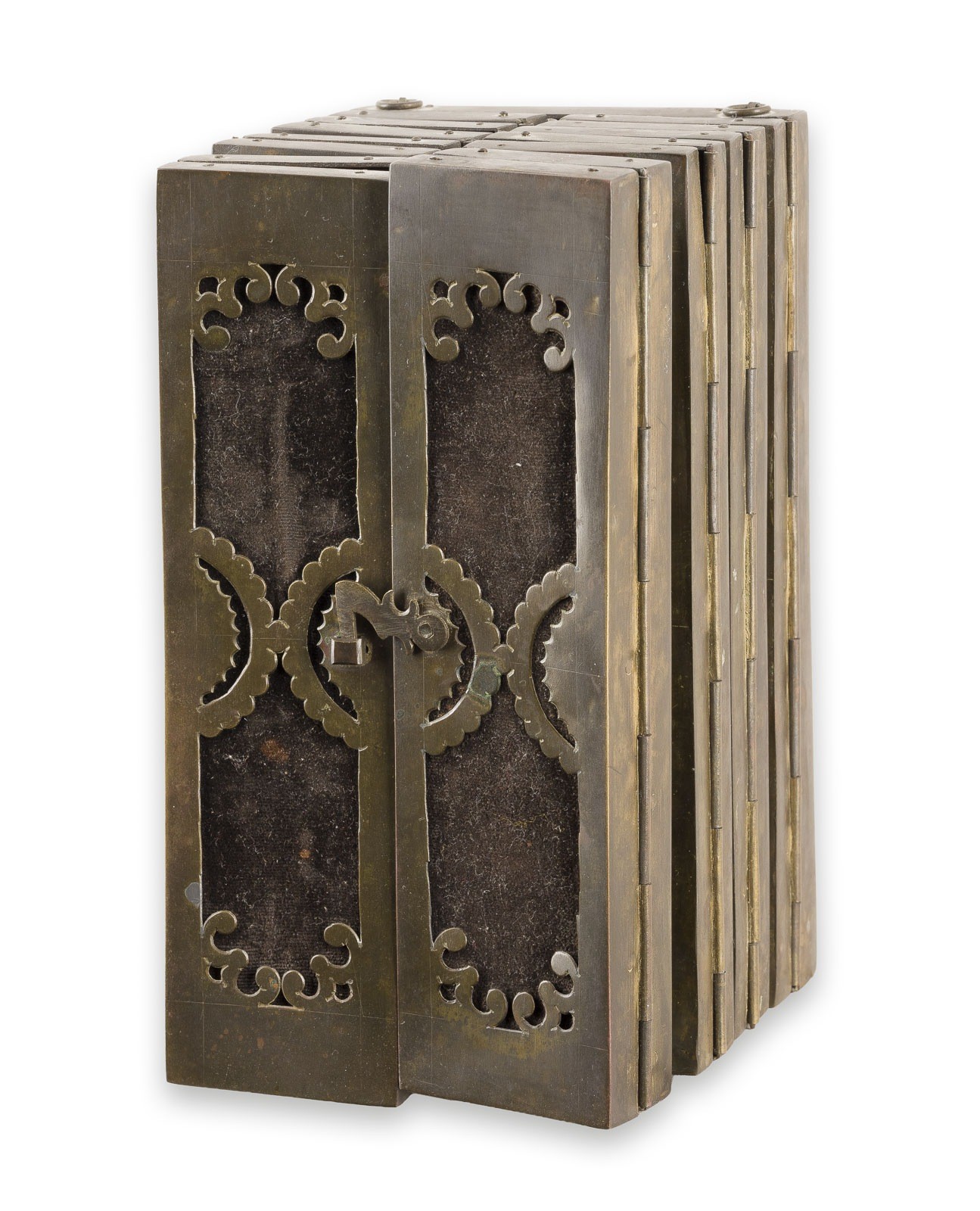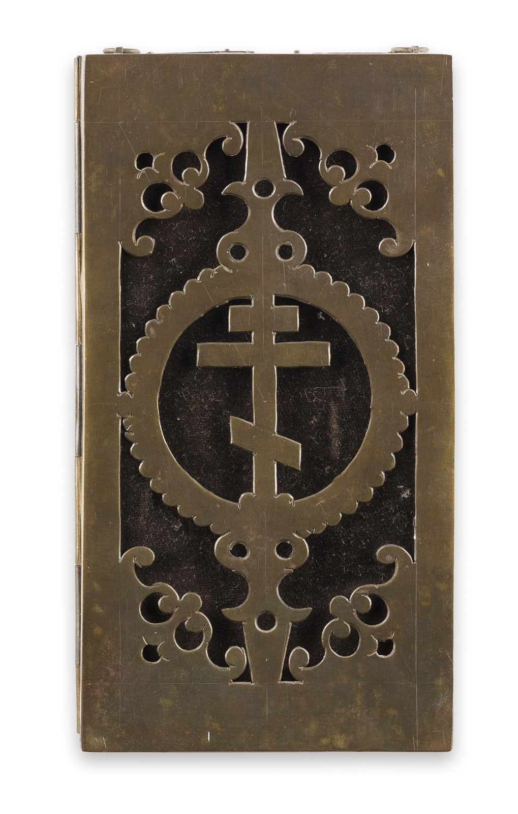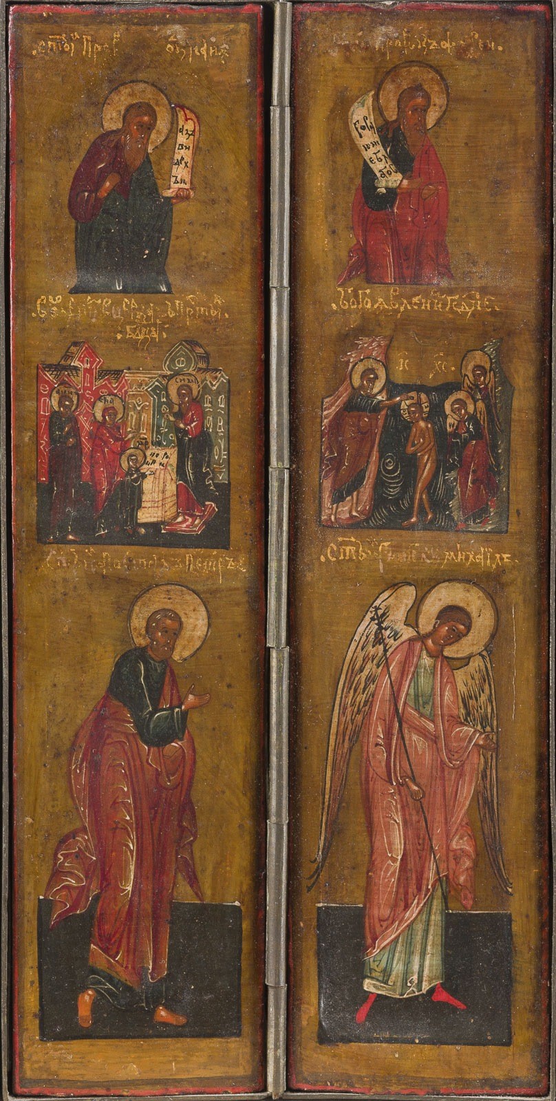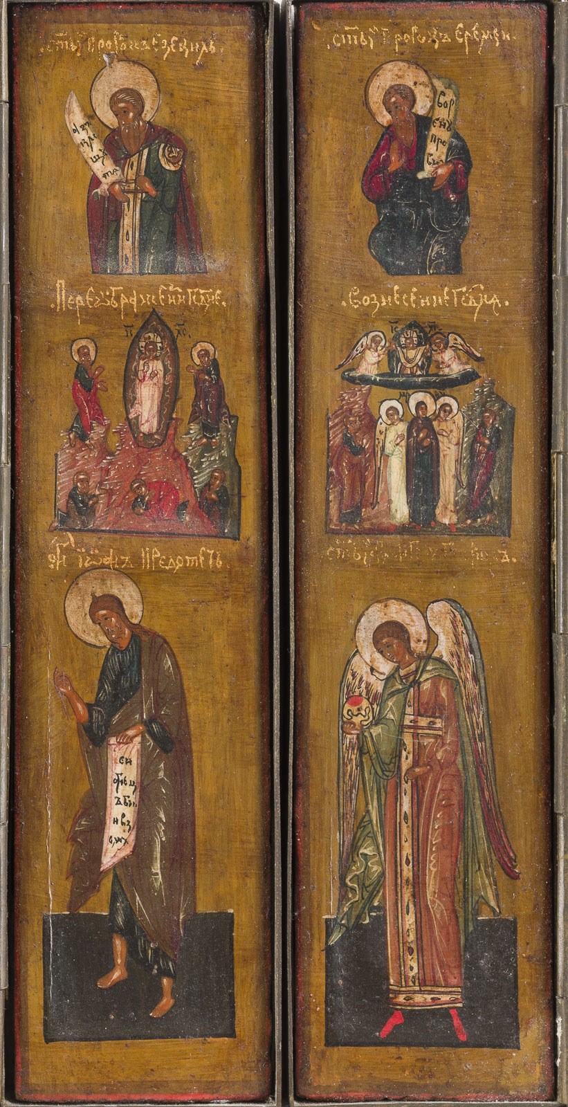 15 Holztafeln mit Kowtscheg, Eitempera auf Kreidegrund, partielle Vergoldung, versilberte Nimben. Metallmontierung. 17,7 x 74 cm (geöffnet). In Miniaturmalerei ausgeführte Malerei über drei Register mit dem thronenden Christus im