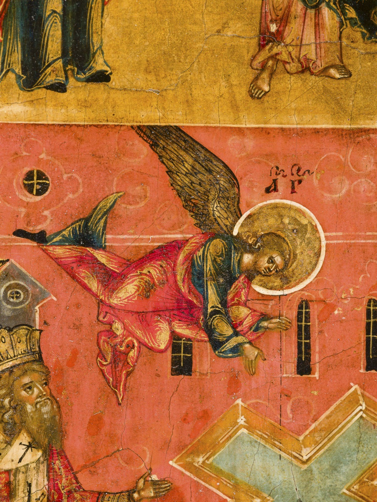 Verbund zweier Bretter mit zwei Rückseiten-Sponki. Kowtscheg, Eitempera auf Kreidegrund, partielle Vergoldung, Chrysographie. 39,7 x 34,1 cm. Die Ikone zeigt ein selten dargestelltes Thema der orthodoxen Bildtradition: die