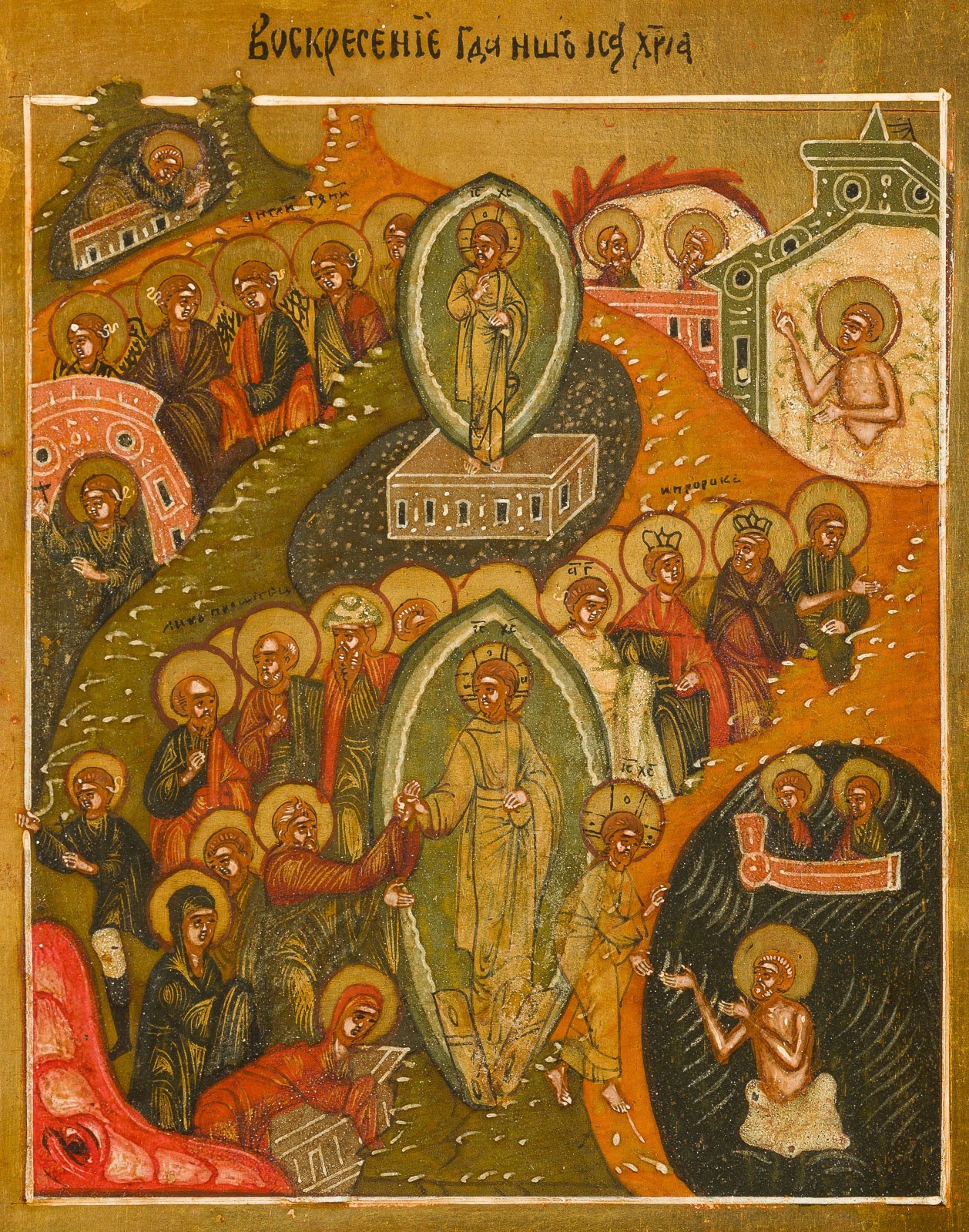 Verbund dreier Zypressenholz-Bretter mit zwei Rückseiten-Sponki. Kowtscheg, Eitempera auf Kreidegrund, Goldgrund. 31 x 26,3 cm. Kleinere Substanzverluste.