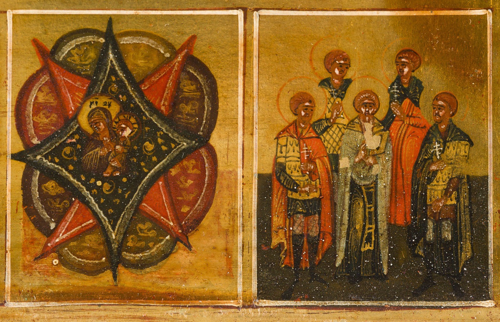 SELTENE FESTTAGSIKONE MIT DER GOTTESMUTTER 'UNVERBRENNBARER DORNBUSCH' UND DEN FÜNF MÄRTYRERN VON SEBASTE