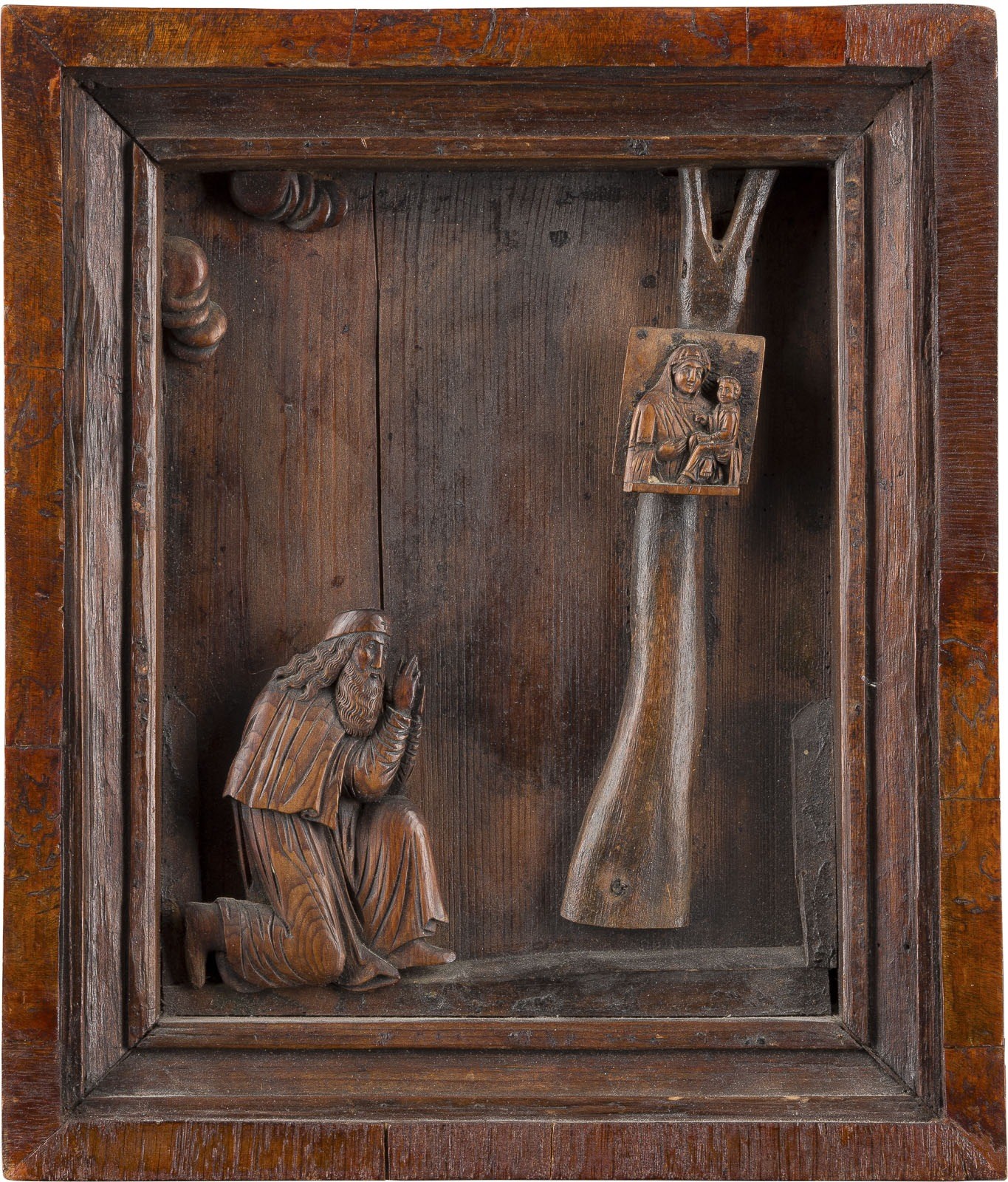 Holz, vollplastisch geschnitzt. 28,5 x 24 cm.