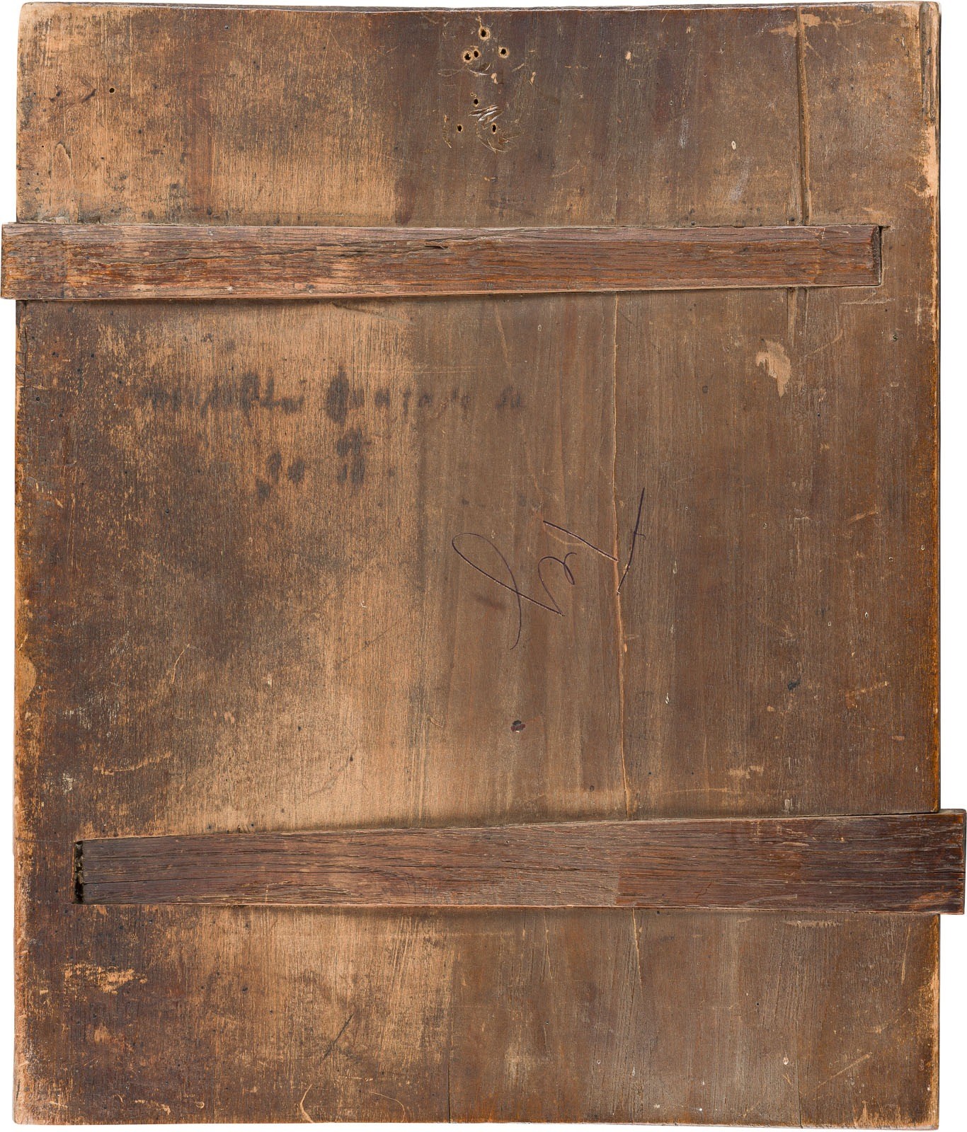 Einzeltafel mit zwei Rückseiten-Sponki. Kowtscheg, Eitempera auf Kreidegrund, Rand teils vergoldet. 35,8 x 30,1 cm. Seltene Ornamentierung des Randes mit Volutenmotiven. Min. rest.