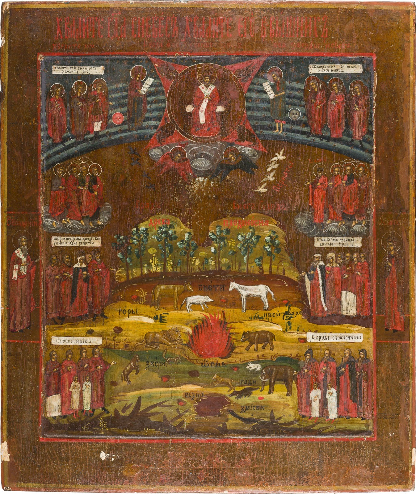 Verbund zwei Bretter mit zwei Rückseiten-Sponki (verloren). Kowtscheg, Eitempera auf Kreidegrund. 52,7 x 45 cm. Die Ikone 'Alles, was Atem hat, lobe den Herrn' zeigt die universale Lobpreisung Gottes