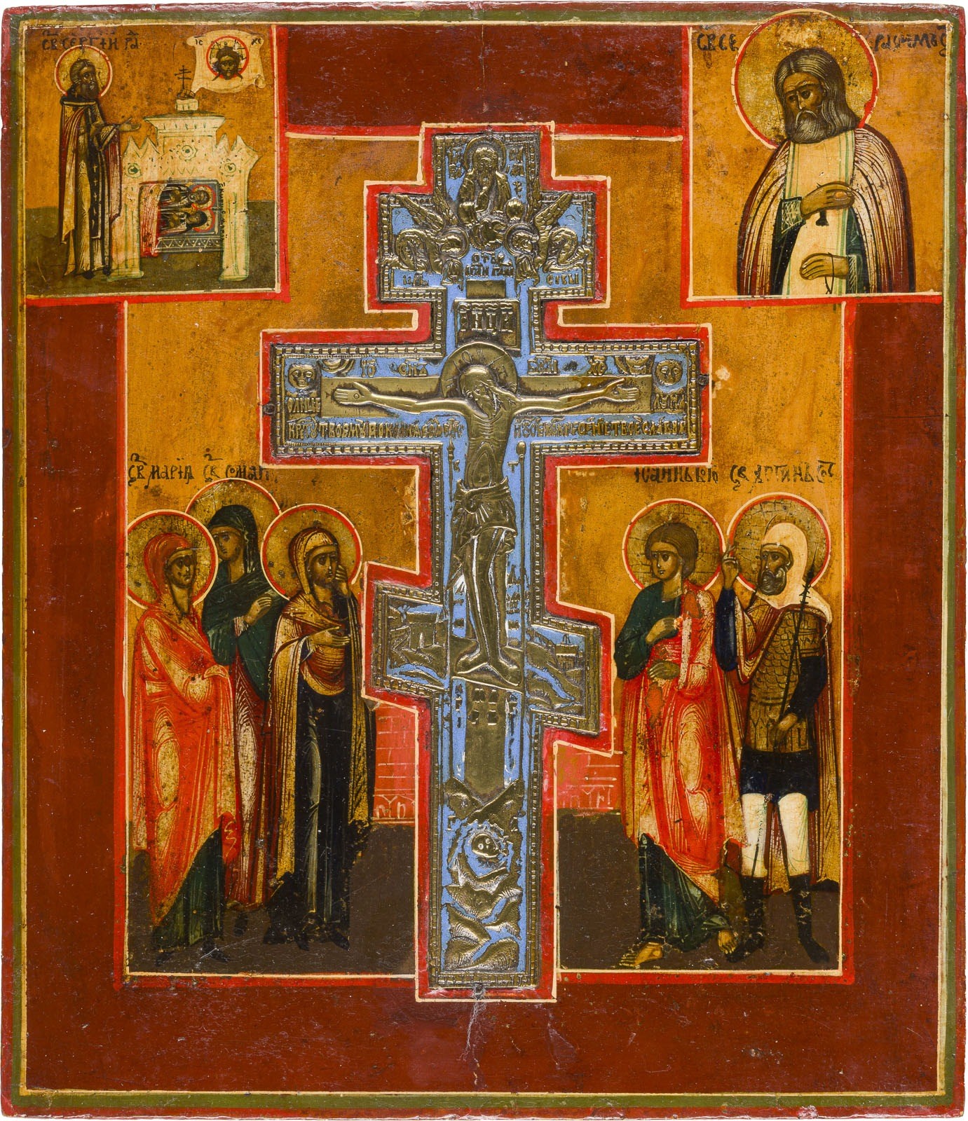 STAUROTHEK-IKONE MIT DER KREUZIGUNG CHRISTI, DEM HEILIGEN SEGEJ VON RADONESCH UND DEM HEILIGEN SERAFIM VON SAROW
