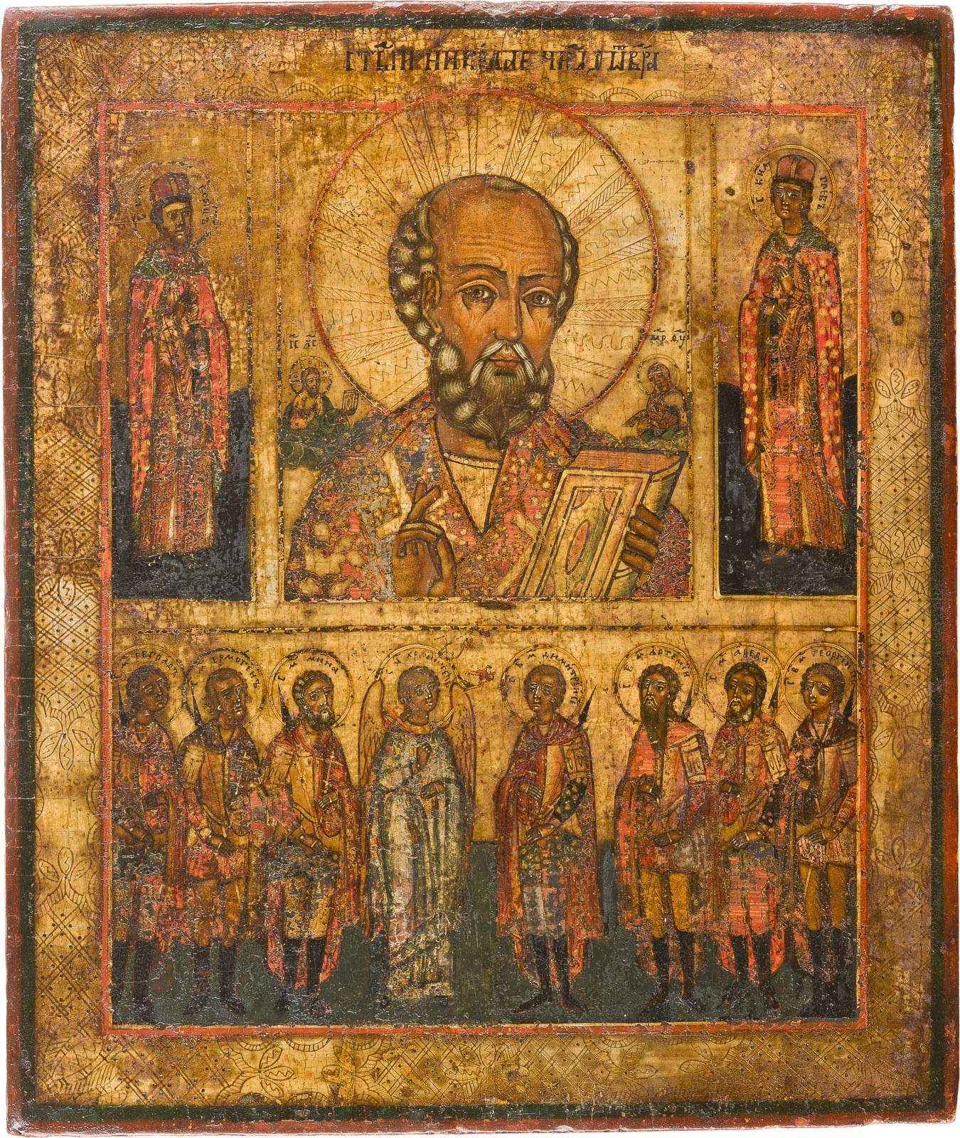 VIERFELDER-IKONE MIT DEM HEILIGEN NIKOLAUS VON MYRA FLANKIERT VON DEN HEILIGEN BORIS UND GLEB AUS PATRONATSHEILIGEN