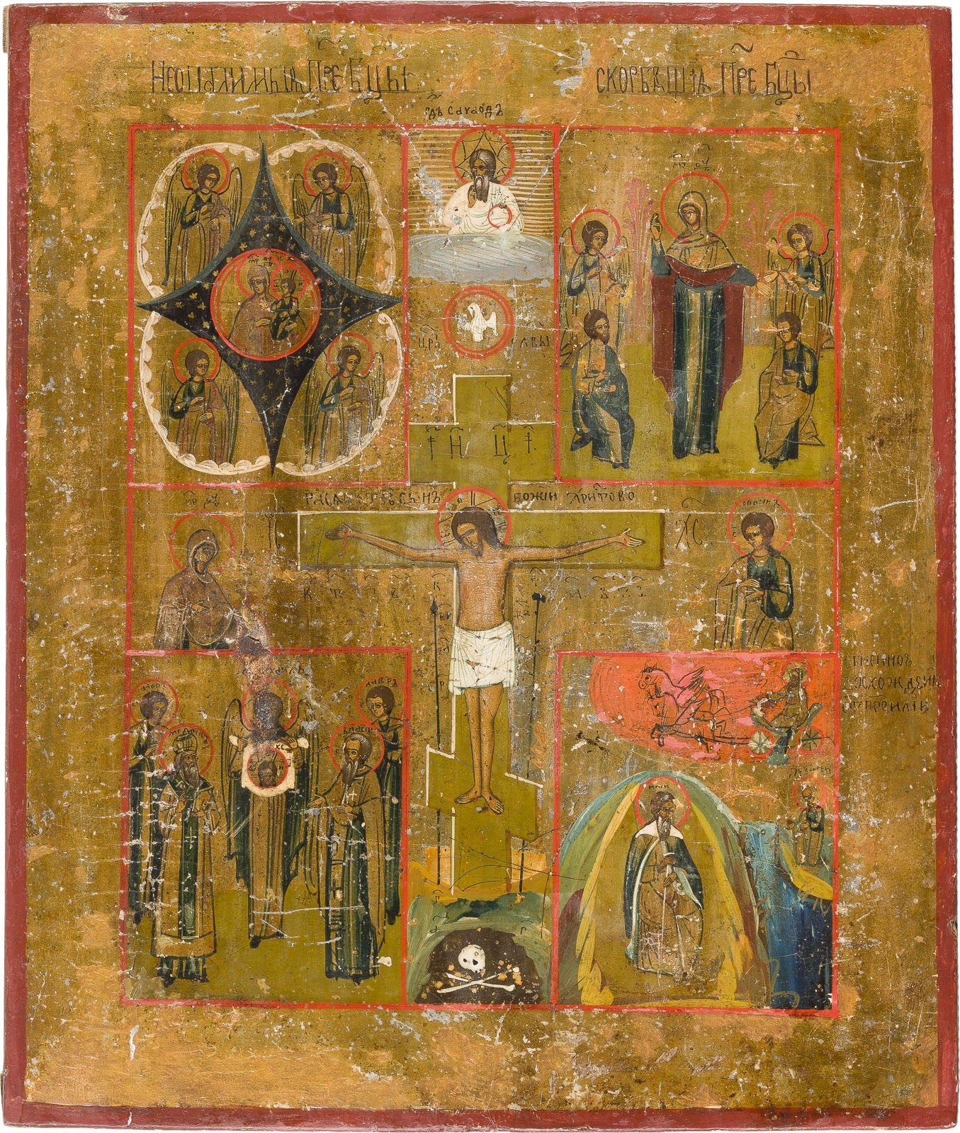 VIERFELDER-IKONE MIT DER KREUZIGUNG, GNADENBILDERN DER GOTTESMUTTER UND HEILIGEN