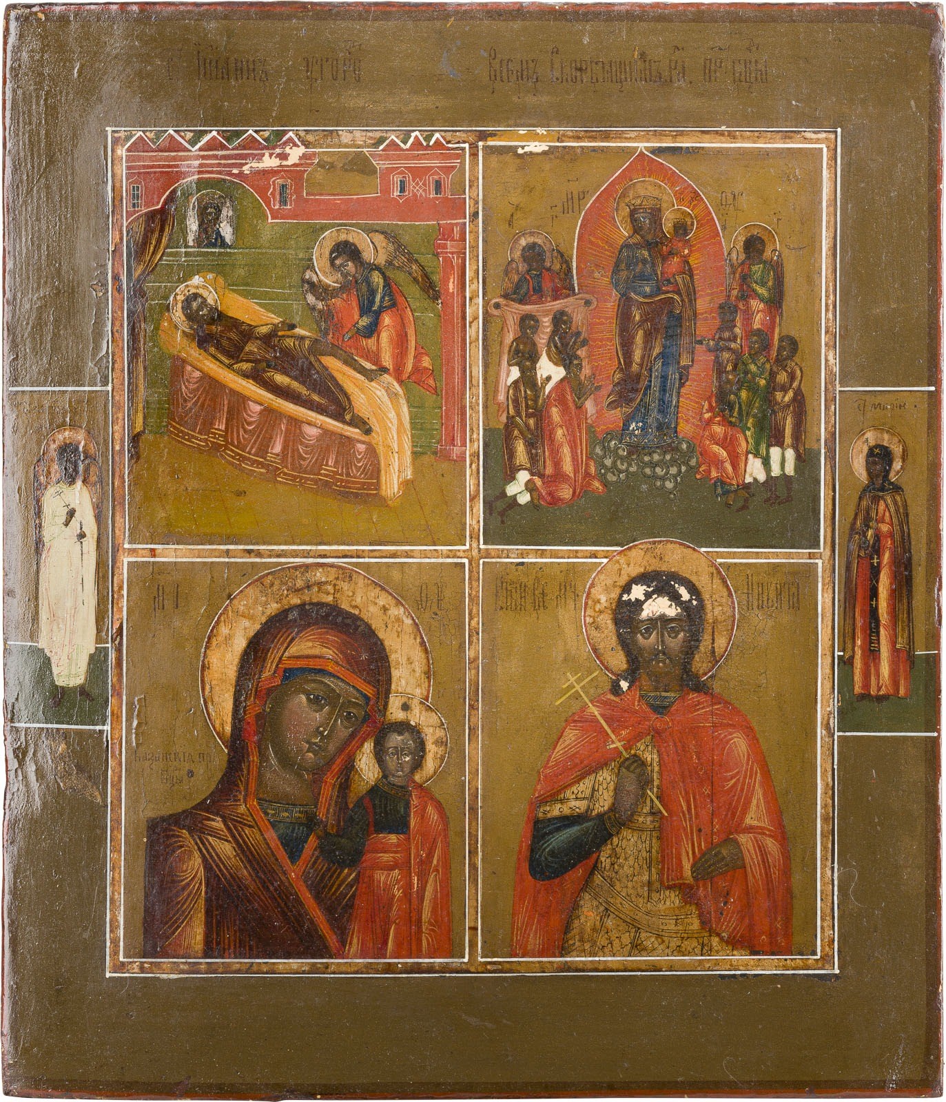 VIERFELDER-IKONE MIT GNADENBILDERN DER GOTTESMUTTER UND DEN HEILIGEN JOHANNES OGORODNIK UND NIKITA