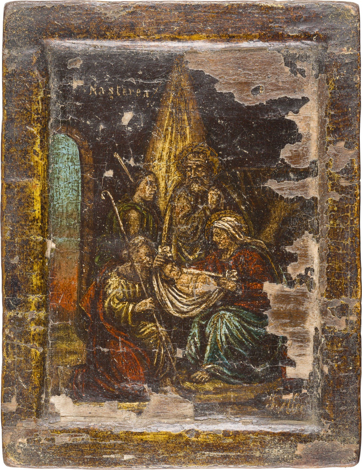 Holztafeln, Ölmalerei auf Kreidegrund, Kowtscheg. 29,6 x 22,9 cm / 36,7 x 26,9 cm. Eine Ikone signiert unten rechts. Substanzverluste.