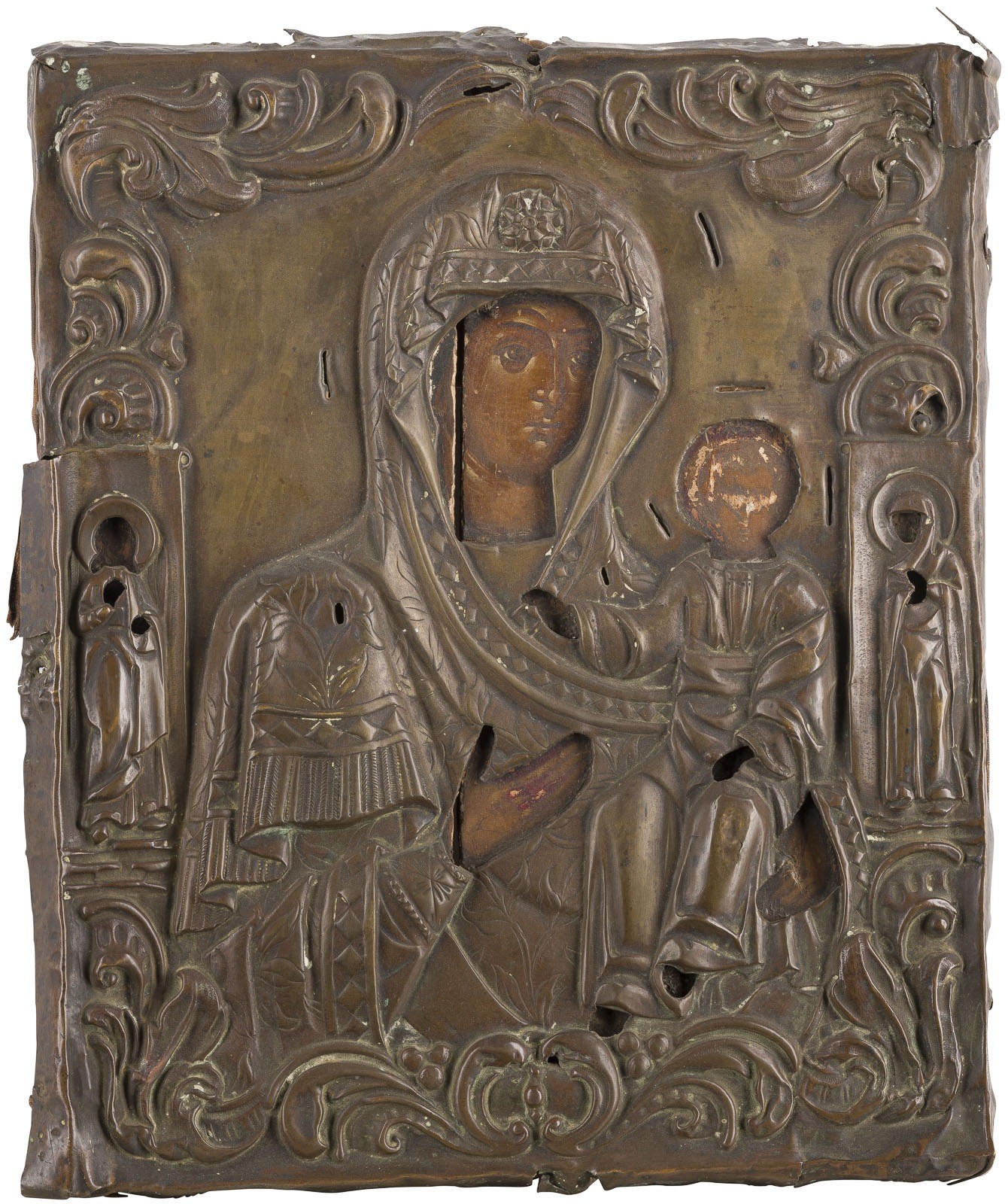 Holztafeln mit Rückseiten-Sponki. Eitempera auf Kreidegrund. Messingoklade mit kräftig getriebenem Dekor. 29 x 24,5 cm / 31,5 x 23,7 cm. Vertikale Risse, Substanzverluste, besch.