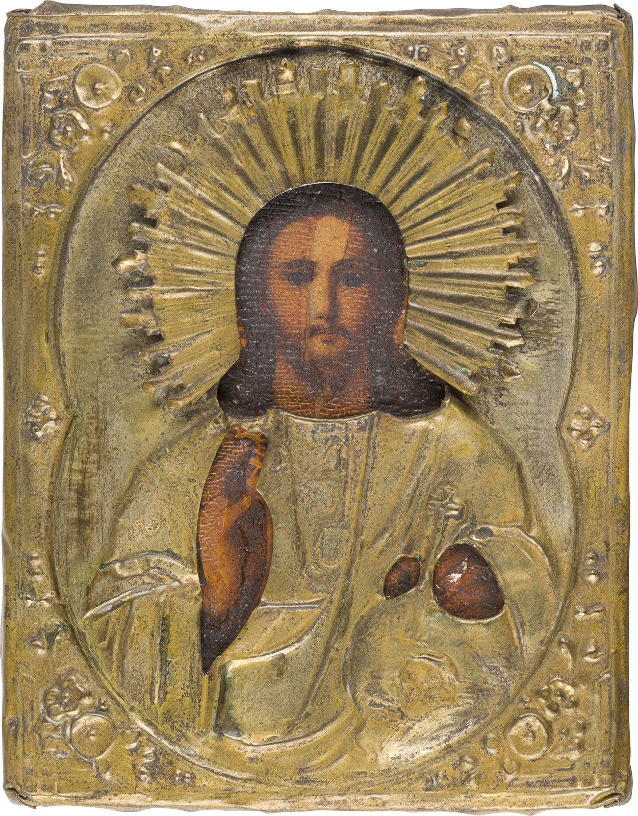 ZWEI KLEINE IKONE: CHRISTUS PANTOKRATOR MIT OKLAD UND VIERFELDER-IKONE