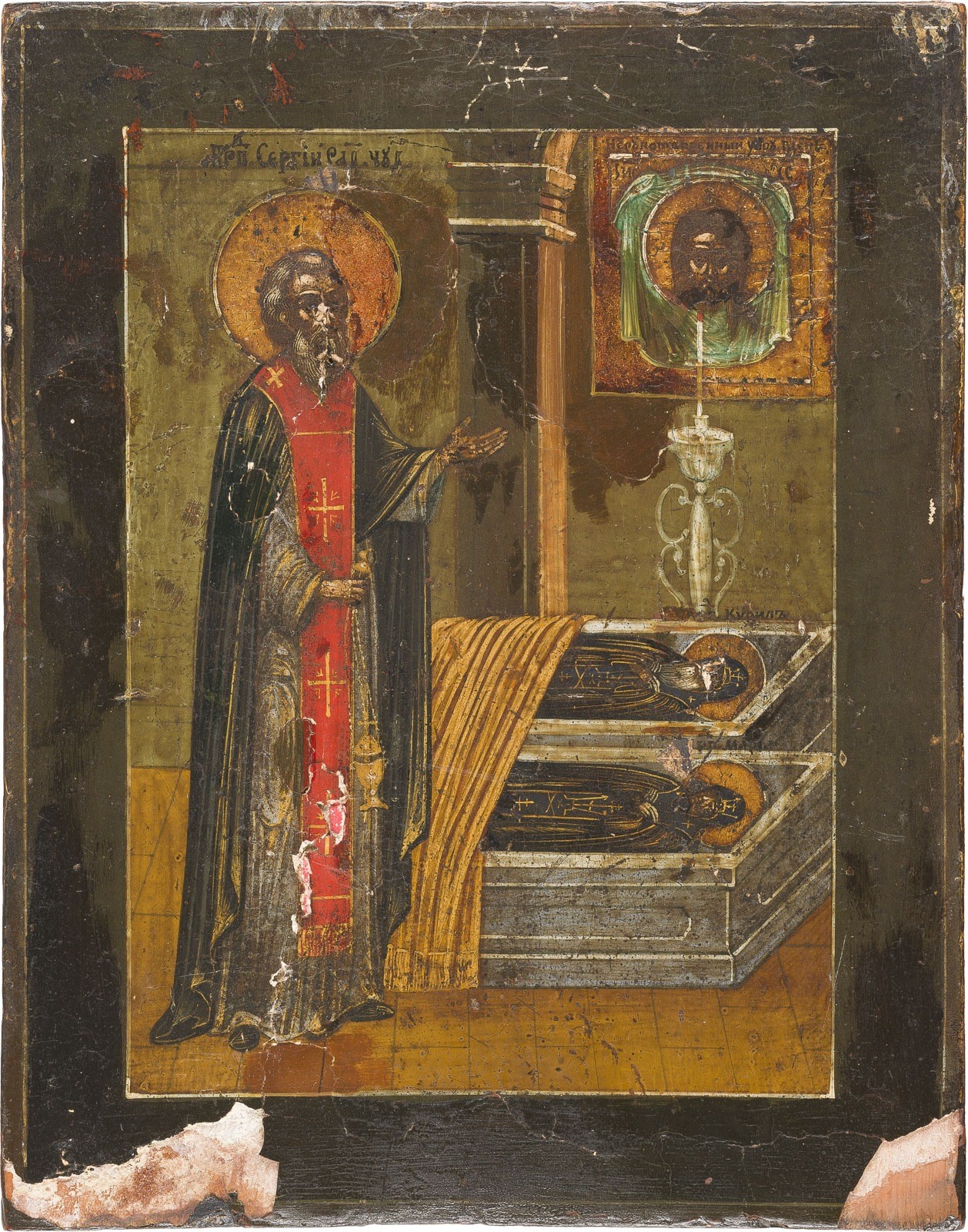 ZWEI KLEINE IKONEN: HEILIGER NIKOLAUS VON MYRA UND HEILIGER SERGEJ VON RADONESCH AM GRAB SEINER ELTERN