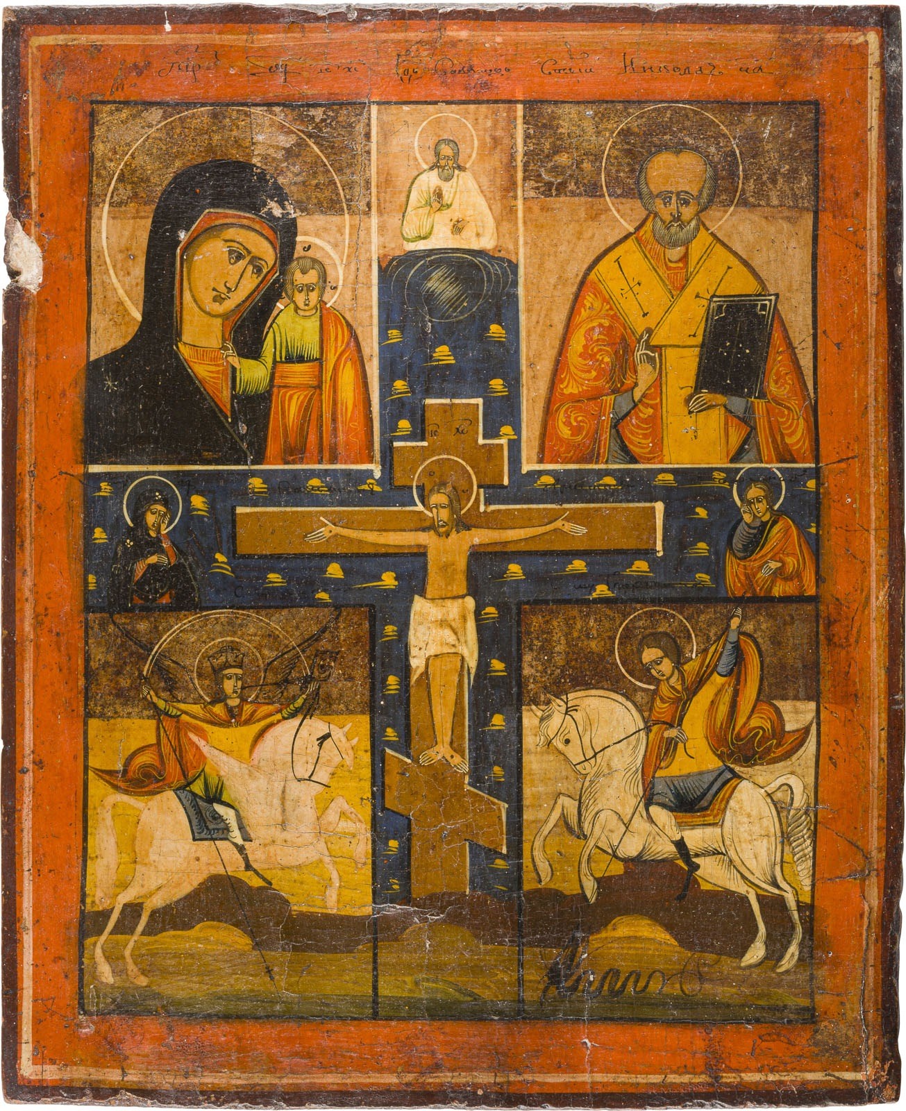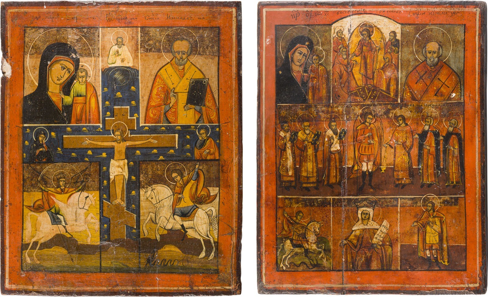 ZWEI MEHRFELDER-IKONEN MIT GNADENBILDERN DER GOTTESMUTTER, DER KREUZIGUNG UND HÖLLENFAHRT UND HEILIGEN