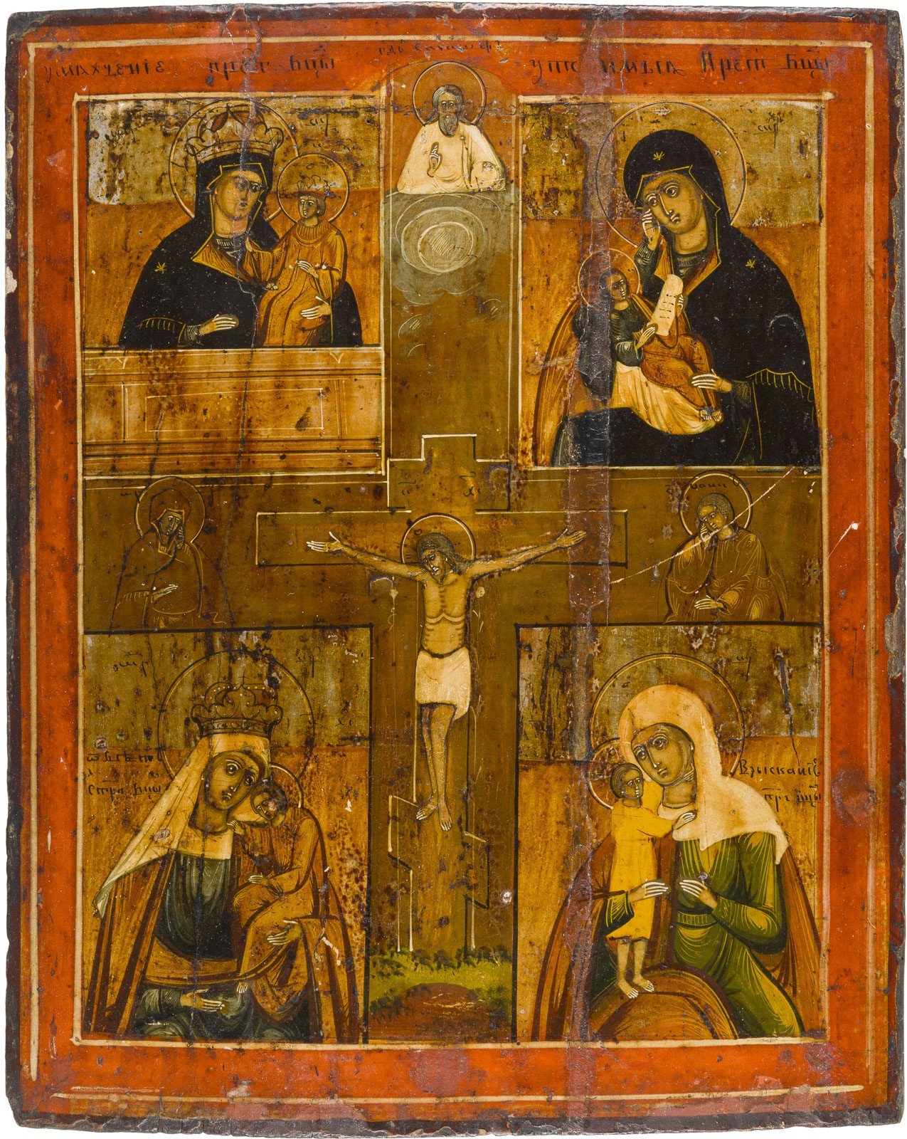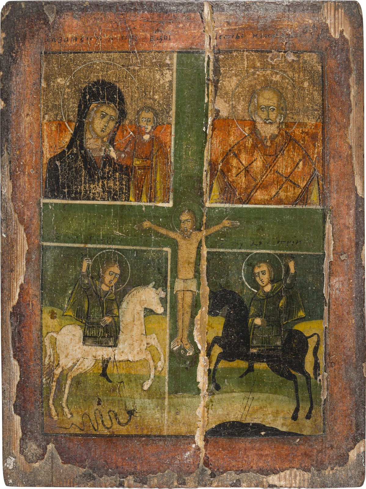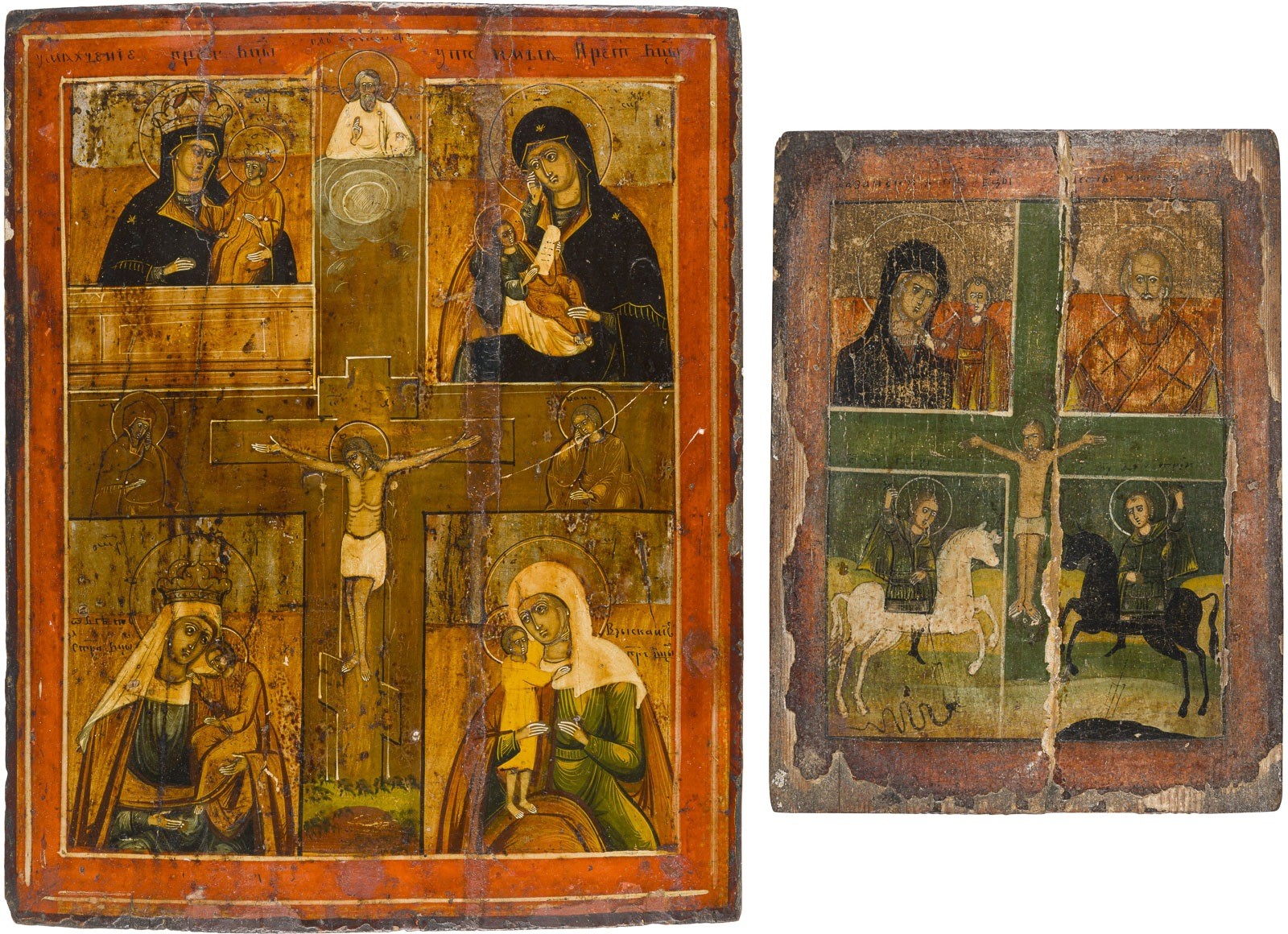 ZWEI VIERFELDER-IKONEN MIT GNADENBILDERN DER GOTTESMUTTER UND REITER-HEILIGEN