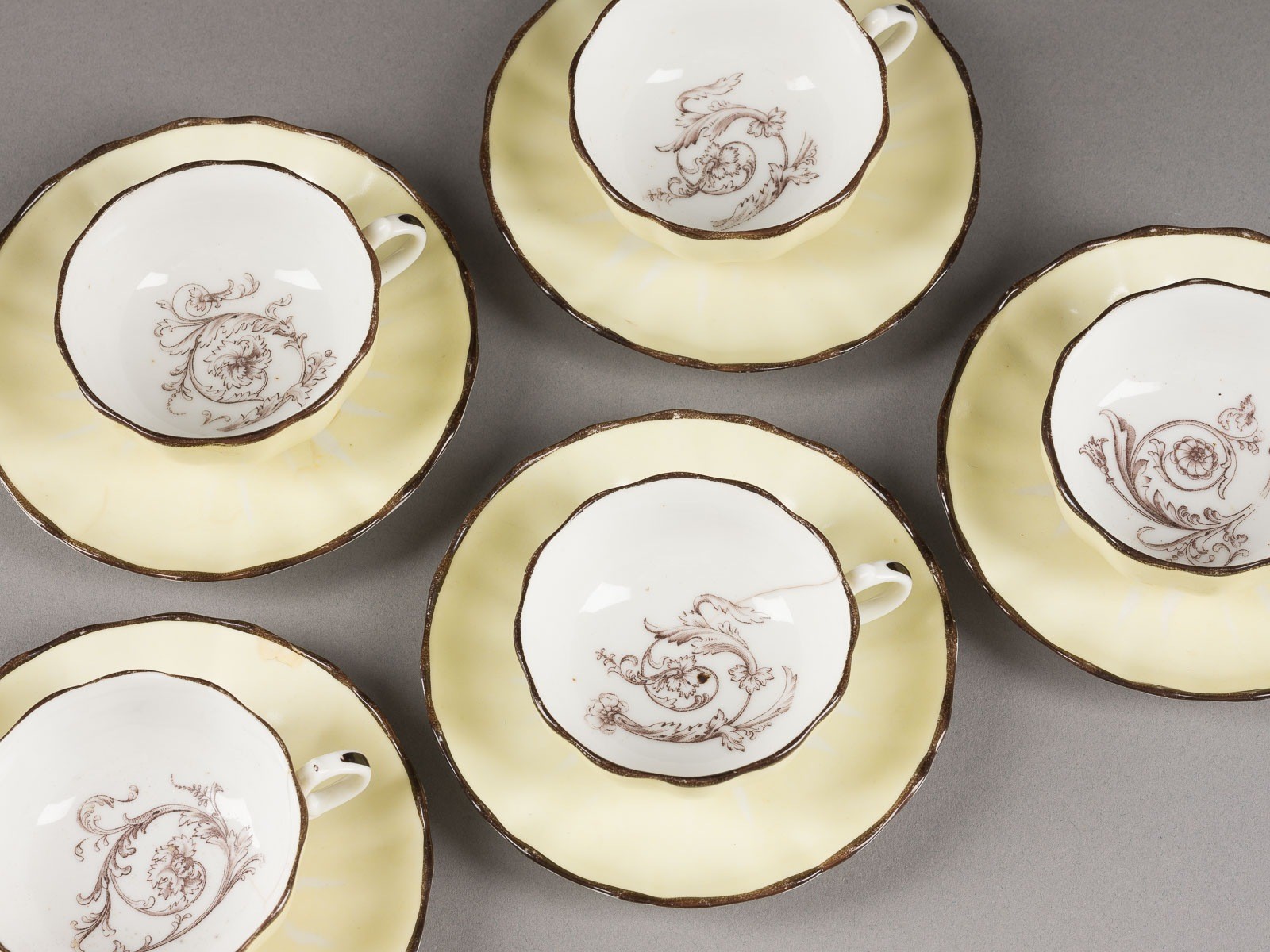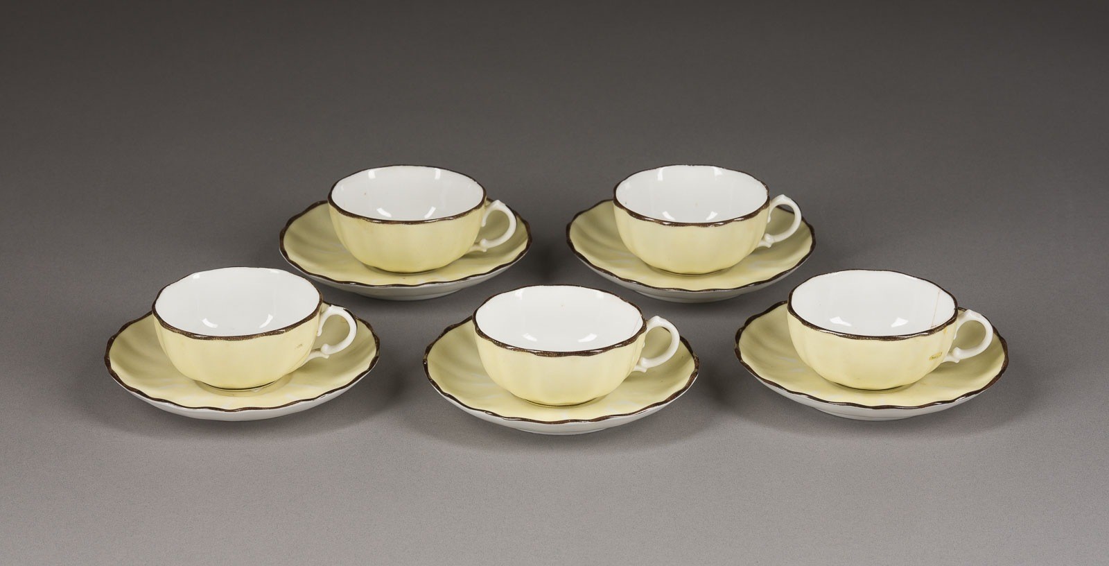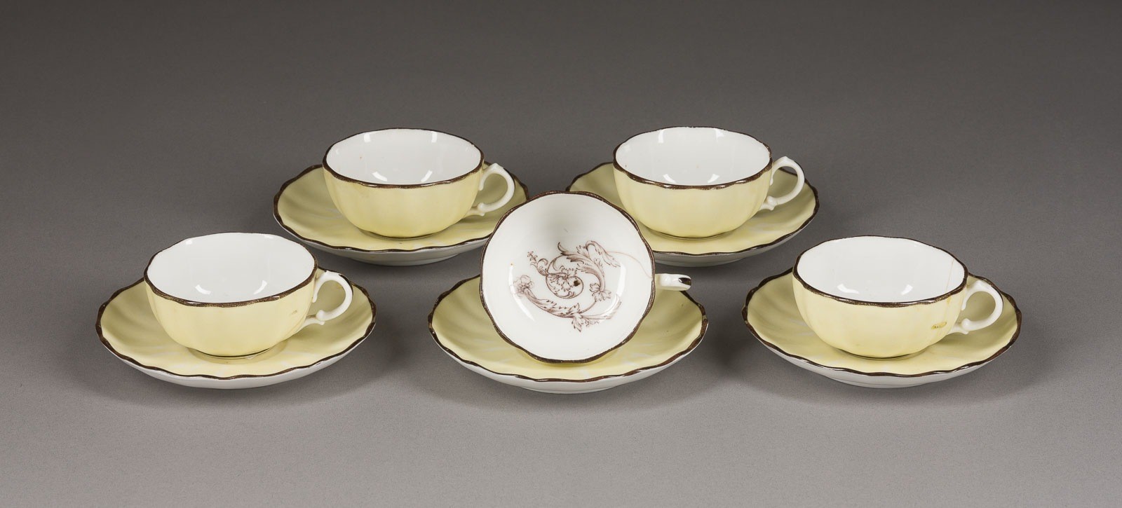 Porzellan, brauner floraler Dekor. D. 7,3-12,2 cm. Unterglasurblaue kyrillische Manufakturmarke 'AP'. Bestehend aus: 5 Tassen und 5 Untertassen. Teils best.