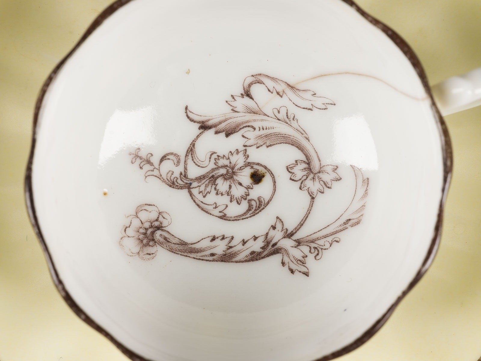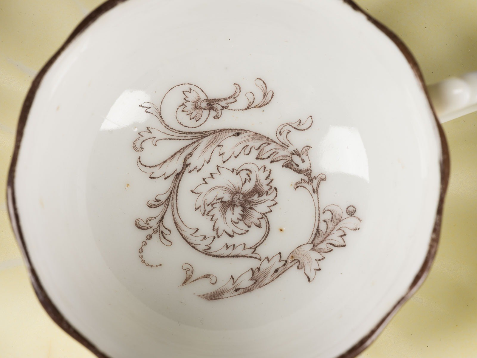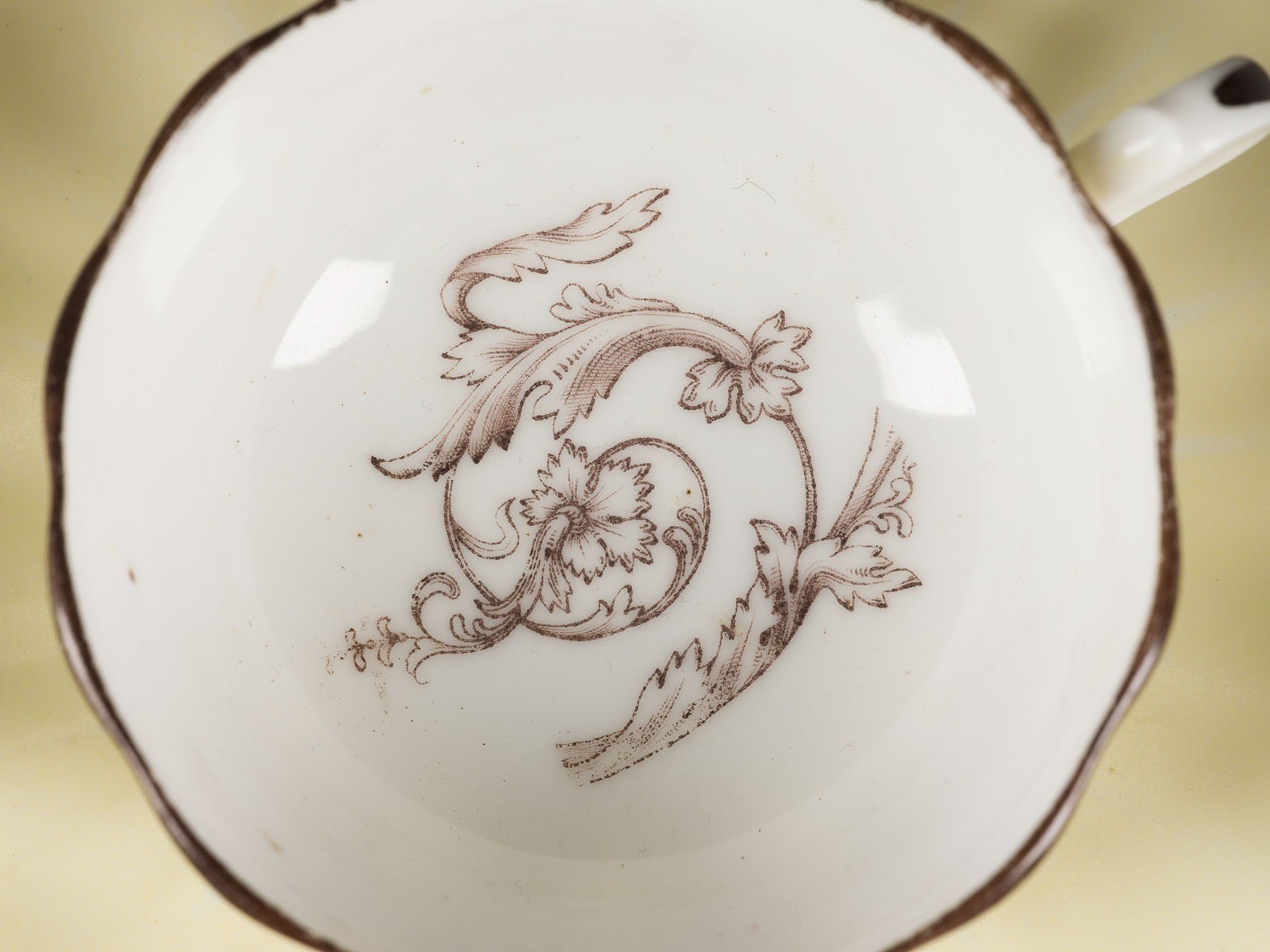 Porzellan, brauner floraler Dekor. D. 7,3-12,2 cm. Unterglasurblaue kyrillische Manufakturmarke 'AP'. Bestehend aus: 5 Tassen und 5 Untertassen. Teils best.