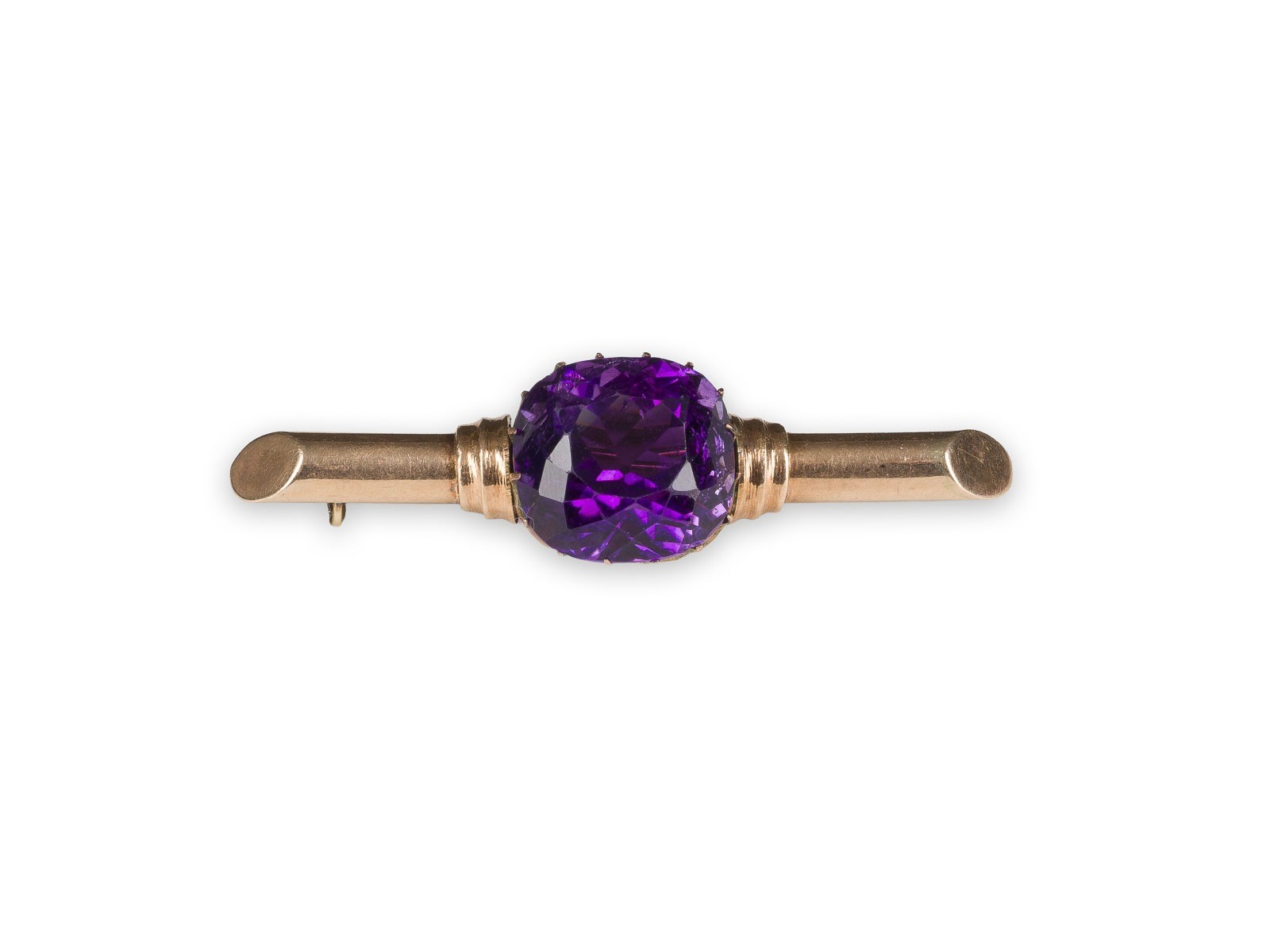 Gold, Amethyst. L. 5 cm, 7 g. Punziert mit Beschaumarke, Feingehalt '56' und Meisterzeichen.