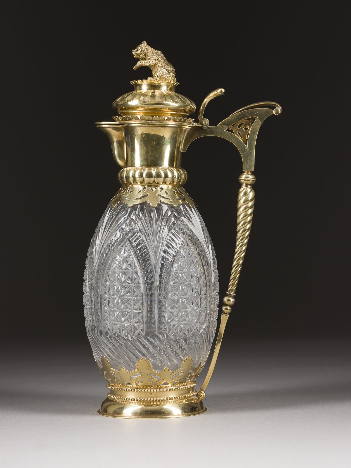 Farbloses, schliffverziertes Glas, vergoldete Silbermontierung. H. 31 cm. Punziert mit Stadtmarke, Feingehalt '84' und Meistermarke.