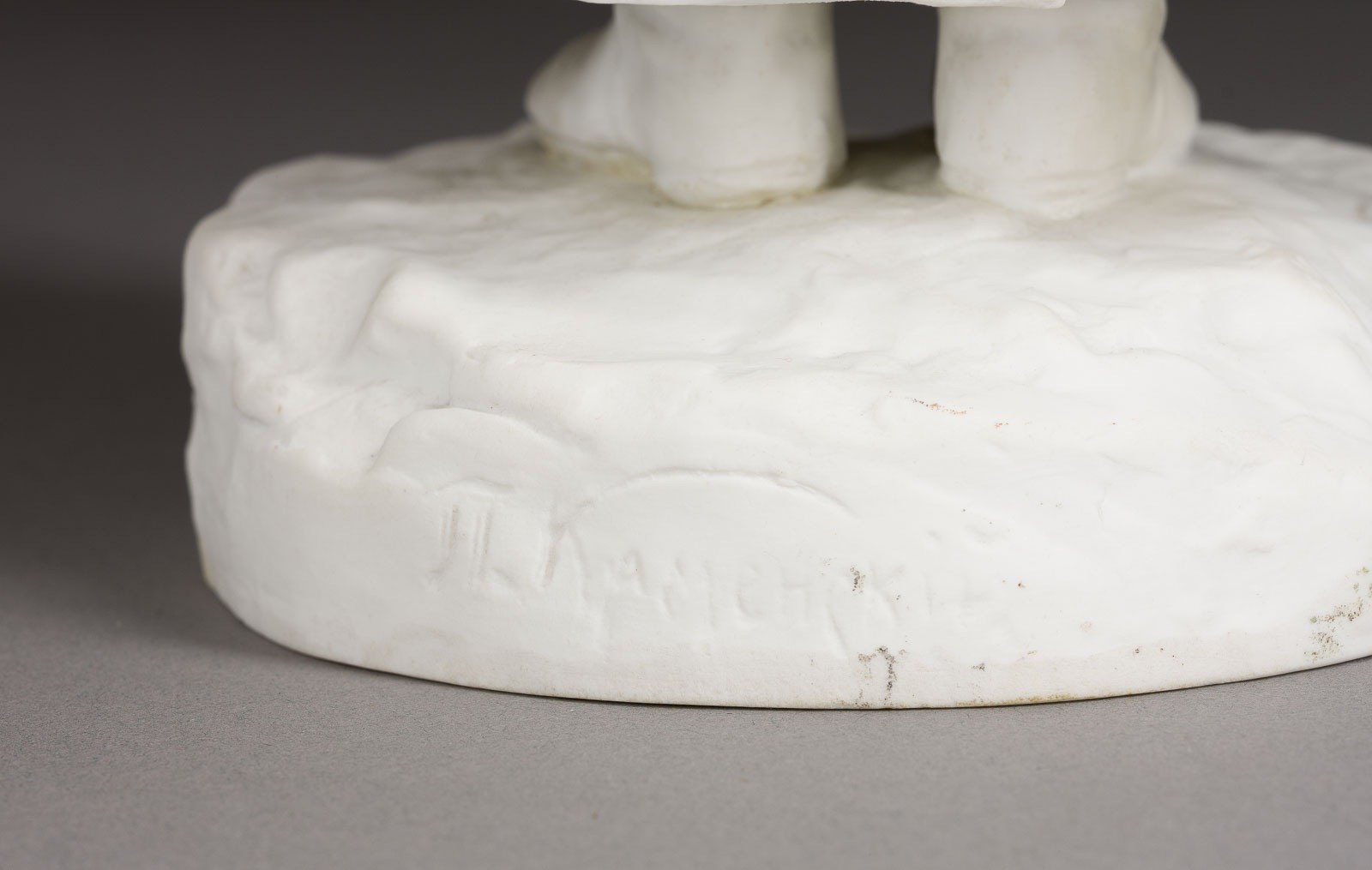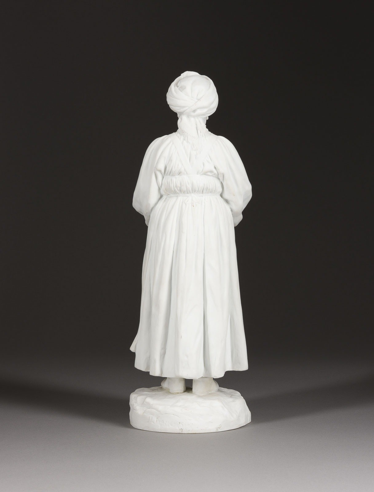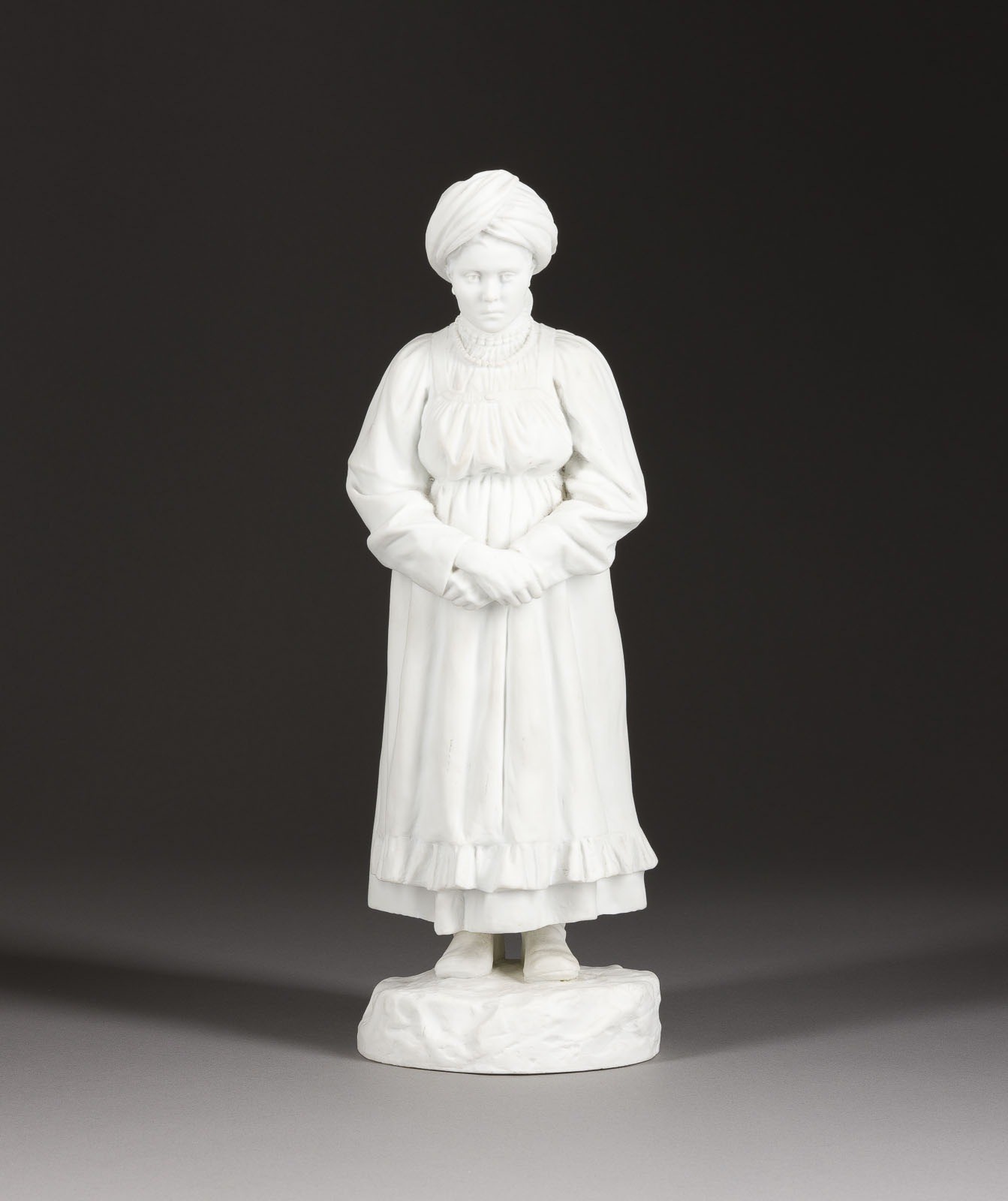 Biskuitporzellan. H. 37,5 cm. Grüne Manufakturmarke 'NII 1909' unter Krone, auf dem Sockel in Kyrillisch signiert und datiert 'P. Kamenski 19(?)', auf der Unterseite in Kyrillsich bez. 'Semejskaja Frau' sowie 'A. Lukin'. Die Figurenserie "Völker Russlands" entstand anlässlich des 300. Jahrestages der