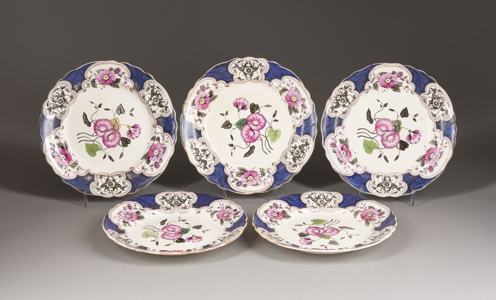 Fayence, Chromolithografie. D. 26,5 cm. Schwarze kyrillische Manufakturmarke 'NI Auerbach N. 120' sowie Pressmarke 'Auerbach' mit dem Doppeladler. Part. Gebrauchsspuren.