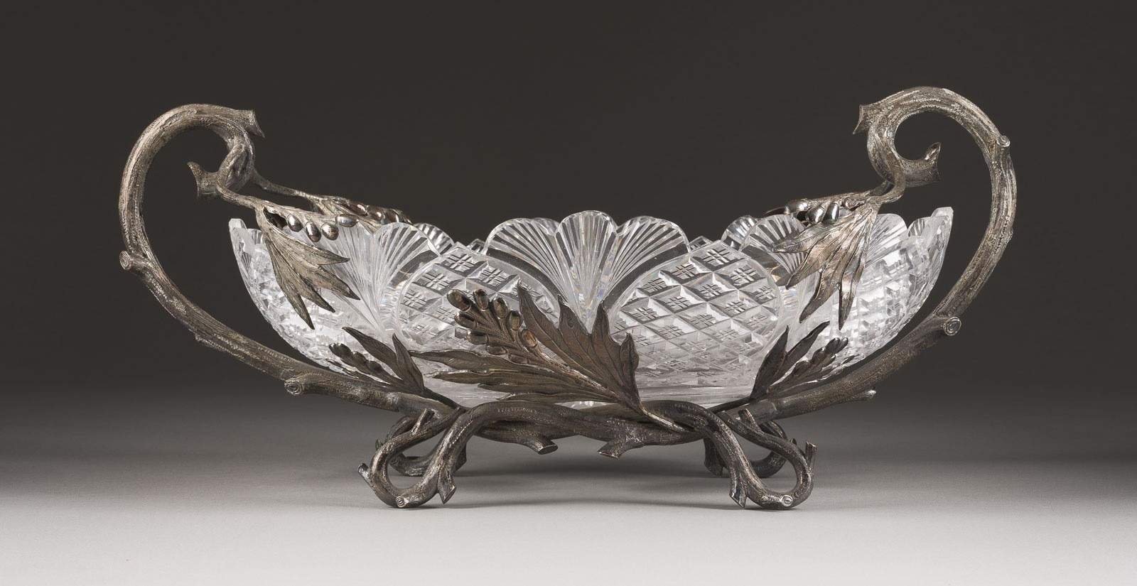 Farbloses, schliffverziertes Glas, Silbermontierung in Form von Astwerk. L. 43 cm. Punziert mit Marke der Bezirksbeschauadministration und Meisterzeichen 'S.A' in Kyrillisch.