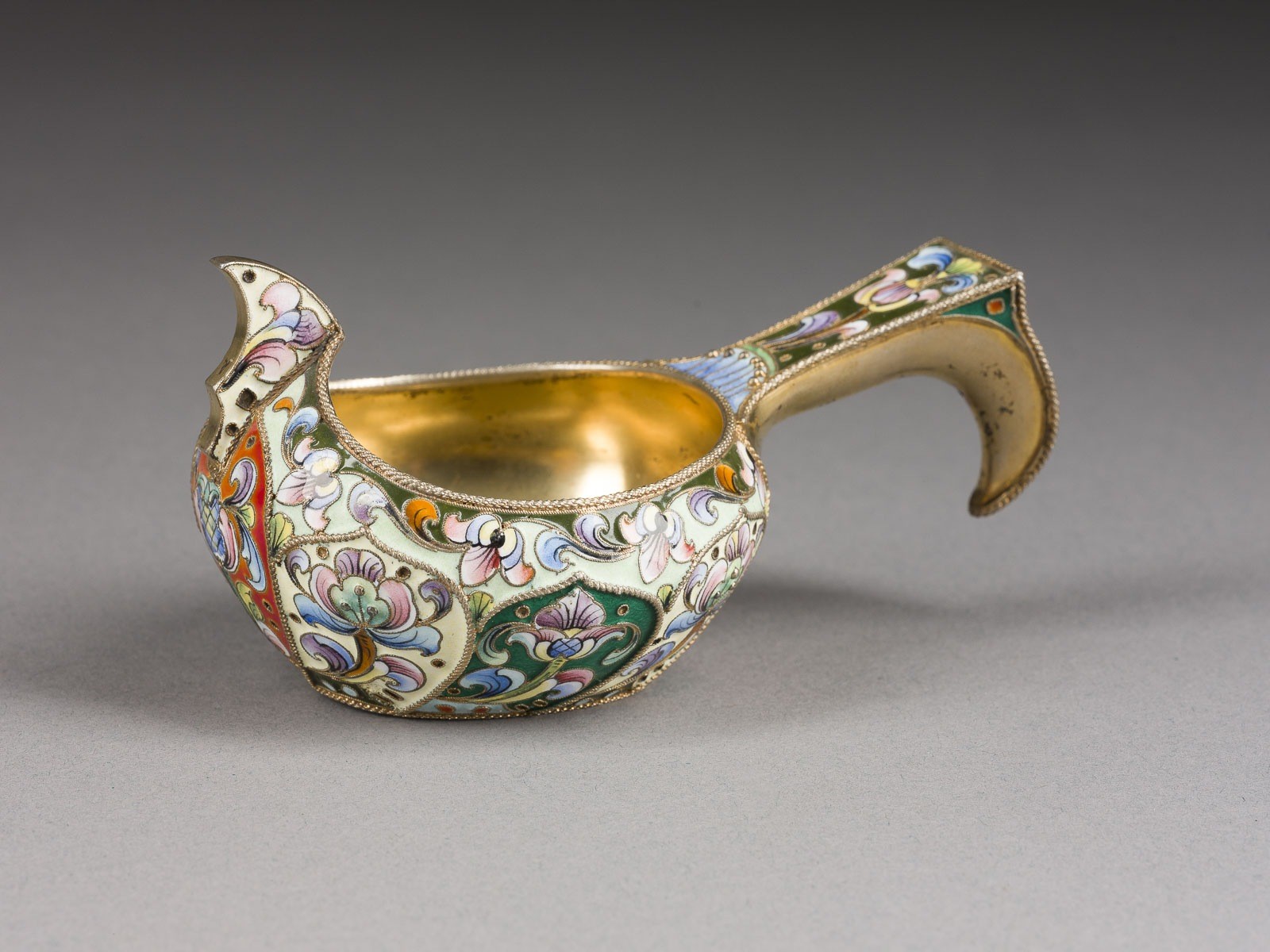 Silber, vergoldet, schattiertes Cloisonné-Email. L. 10 cm, 88 g. Auf der Bodenunterseite punziert mit Marke der Bezirksbeschauadministration mit Feingehalt '84' und Meisterzeichen '6MA'.