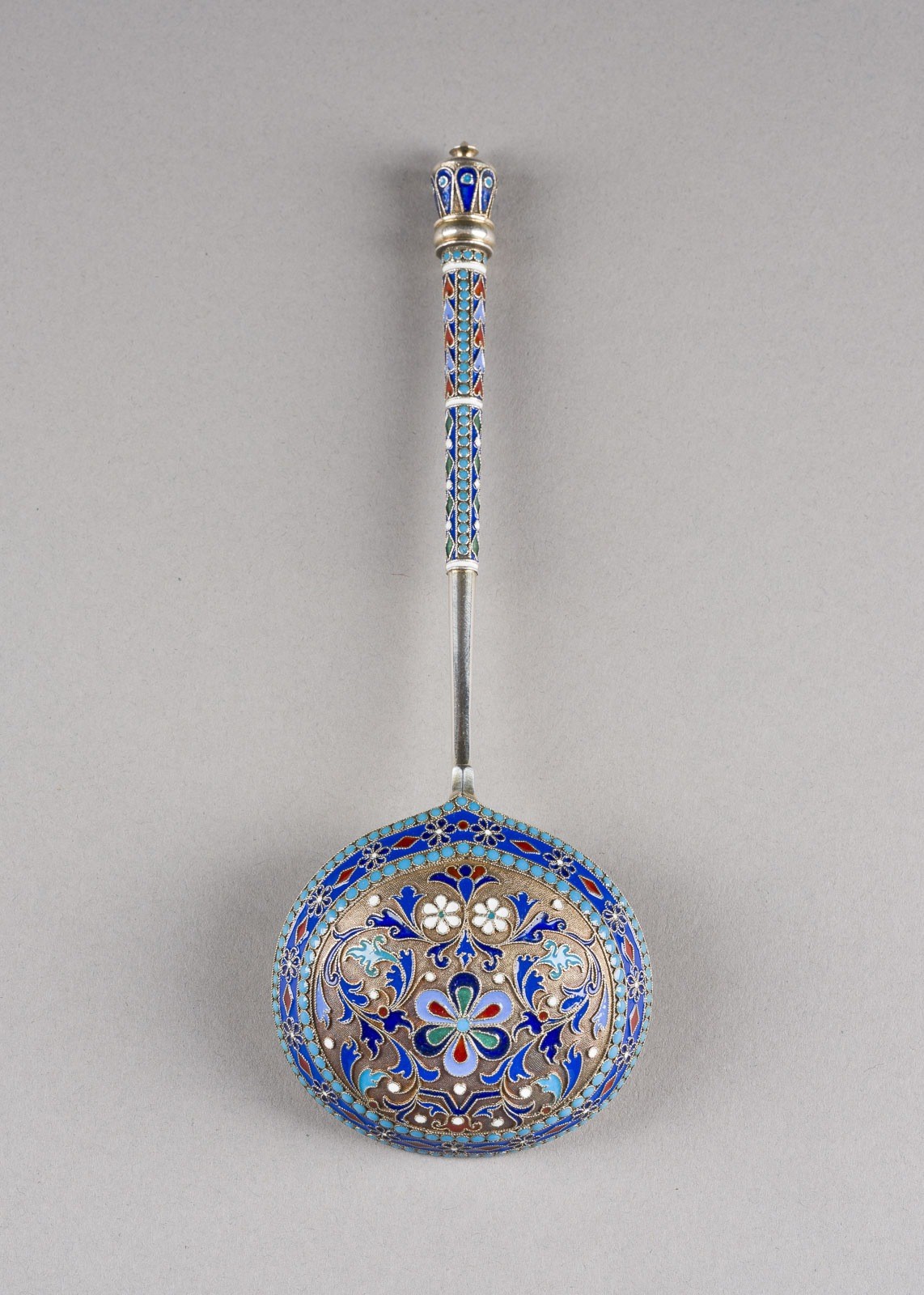 Silber, Email in Rot, Weiß, Grün und Türkis auf punziertem Fond. L. 18,2 cm, 93 g. Punziert mit Stadtmarke, Beschaumeisterzeichen, Feingehalt '84' und Meistermarke 'IS' in Kyrillisch.