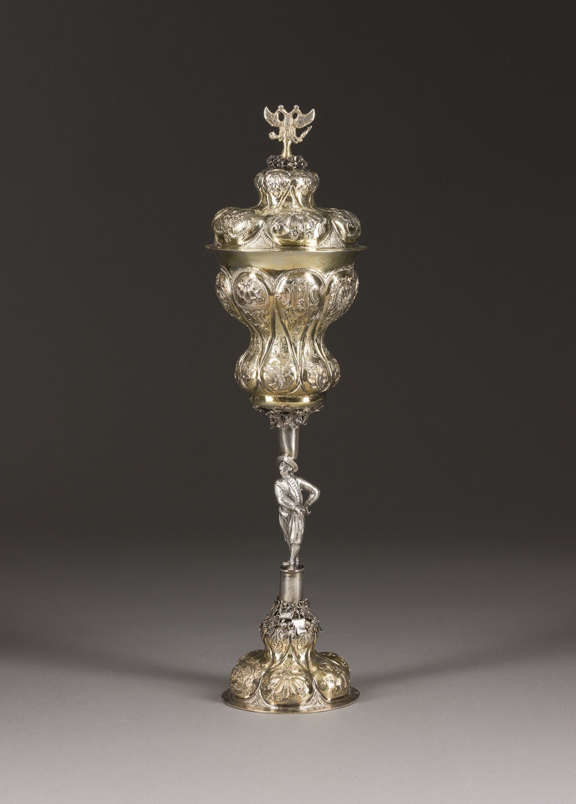 GROSSER DECKEL-POKAL MIT FIGÜRLICHEM SCHAFT UND DOPPELADLER