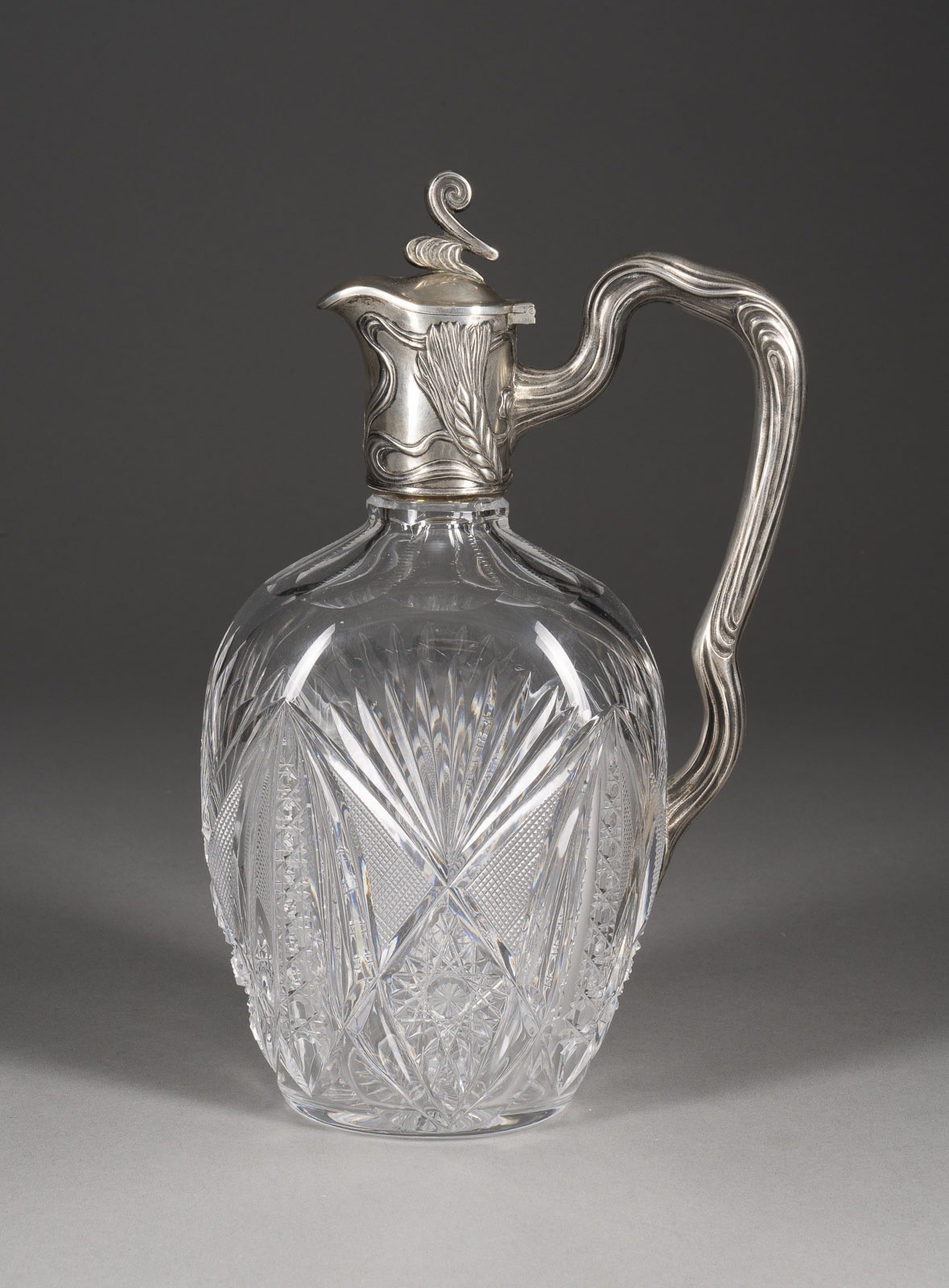 Farbloses, schliffverziertes Glas. Silbermontierung mit reliefiertem Blatt- und Ährendekor. H. 23,5 cm. Punziert mit Marke der Bezirksbeschauadministration mit Feingehalt '84' und Meisterzeichen 'I.T.' in Kyrillisch.