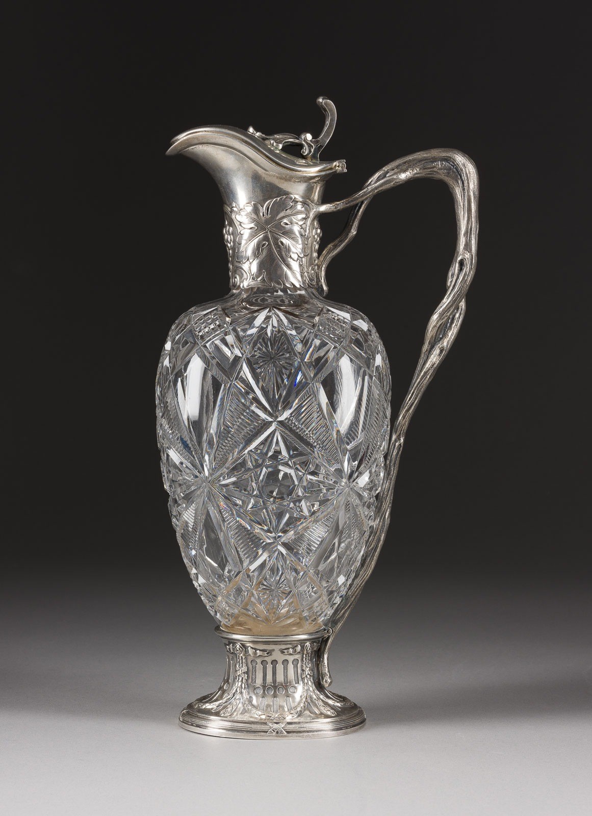 Farbloses, schliffverziertes Glas, Silbermontierung, vegetabil gegossen, innen vergoldet. H. 33,3 cm. Punziert mit Marke der Bezirksbeschauadministration mit Feingehalt '84' und Meisterzeichen 'GRATSCHEW' in Kyrillisch mit Hoflieferantenzeichen.
