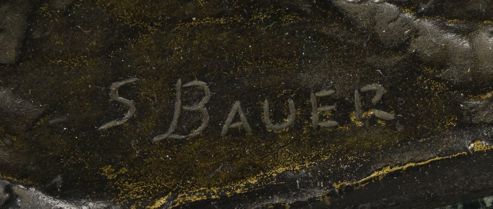 Bronze, vollplastisch gegossen, dunkel patiniert, Marmorplinthe. H. 33,5 cm. Auf dem Sockel signiert 'S. Bauer'. Zaumzeug teilw. gelöst.