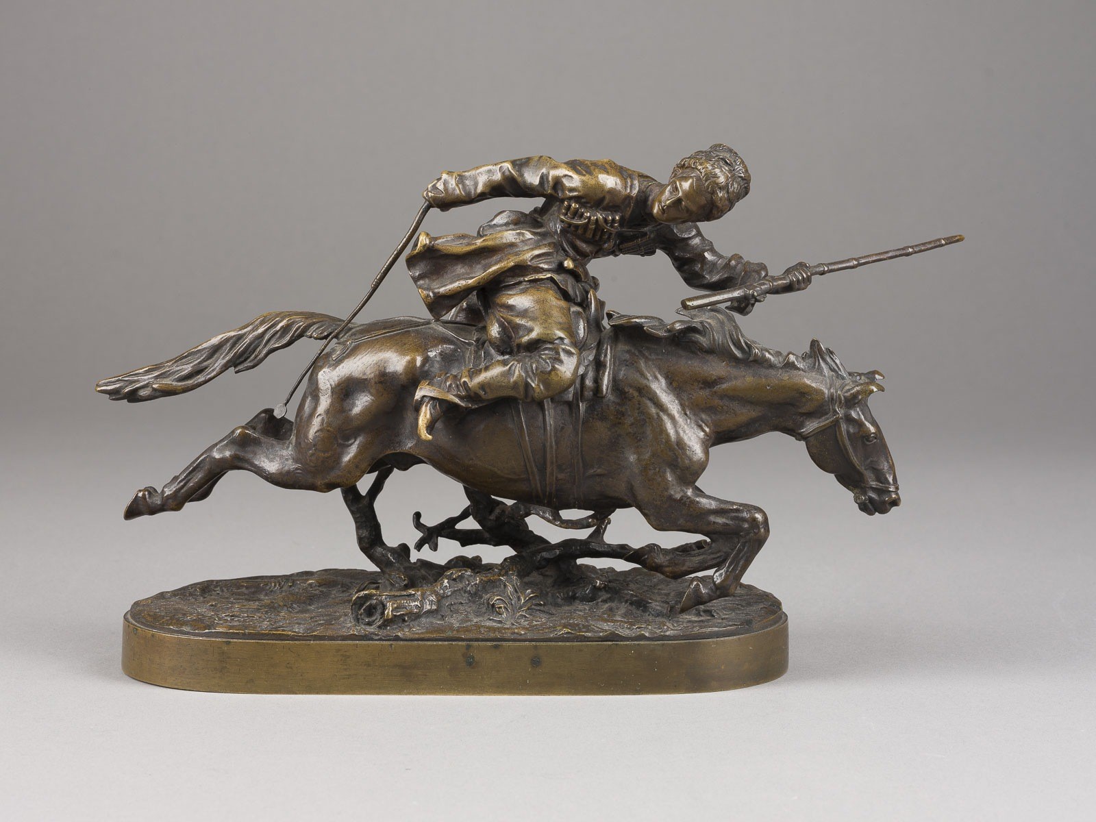 Bronze, vollplastisch gegossen, braun patiniert. L. 29 cm. Auf dem Sockel in Kyrillisch signiert 'J. Lanceray' sowie kyrillischer Gießerstempel 'Gegossen von N. Stange'.
