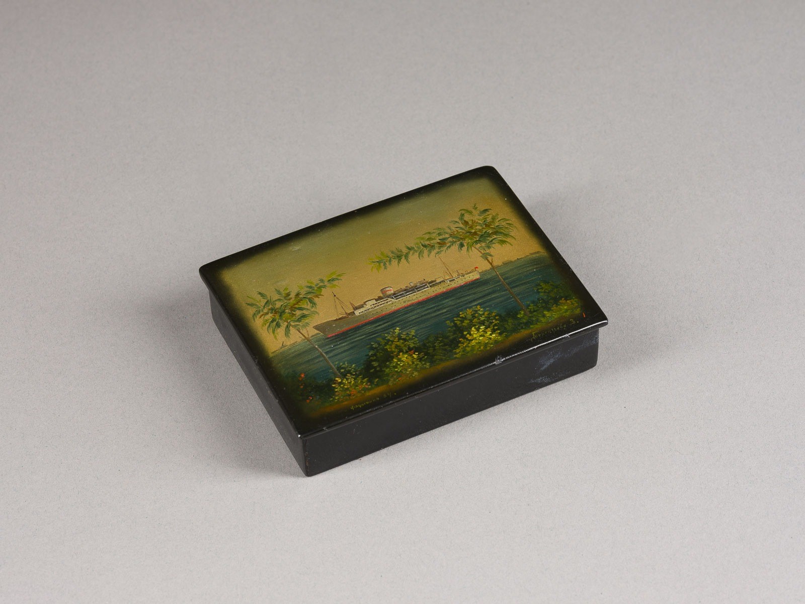 Papiermaché, Schwarzlack, polychrome Bemalung. L. 11 cm. In Kyrillisch signiert, datiert sowie ortbez.
